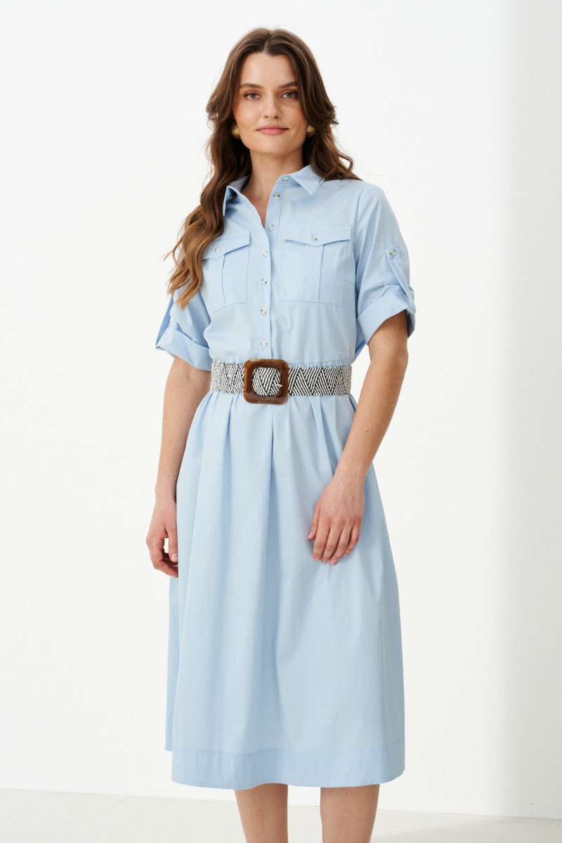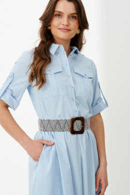 Платье миди – модная модель сезона, которая вашу фигуру стройнее, благодаря приталенному силуэту и ремешку. Платье с воротником рубашечного типа, нагрудными и прорезными боковыми карманами смотрится стильно, лаконично. Рукава с манжетами и патами открывают изящные линии рук. Платье рубашка из хлопкового полотна – мягкое, приятное на ощупь. Оно отлично отводит влагу, пропускает воздух, не сминается. Вы можете купить женское платье в комплекте с красивым съемным декоративным поясом.