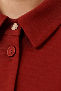 Платье прямого силуэта, воротник отложной, с центральной застежкой на пуговицы, в боковых швах обработаны боковые карманы, низ платья с закругленными разрезами.