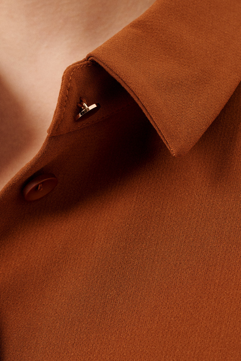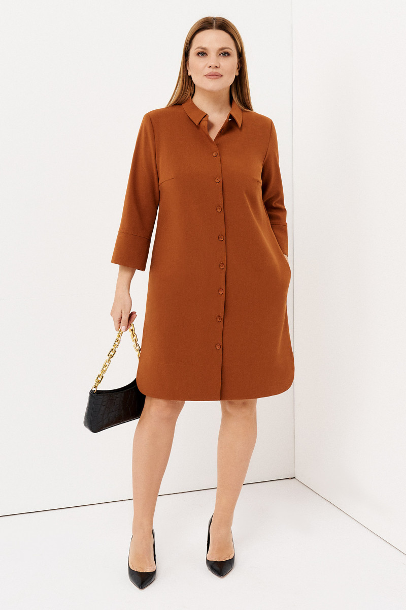 Платье прямого силуэта, воротник отложной, с центральной застежкой на пуговицы, в боковых швах обработаны боковые карманы, низ платья с закругленными разрезами.