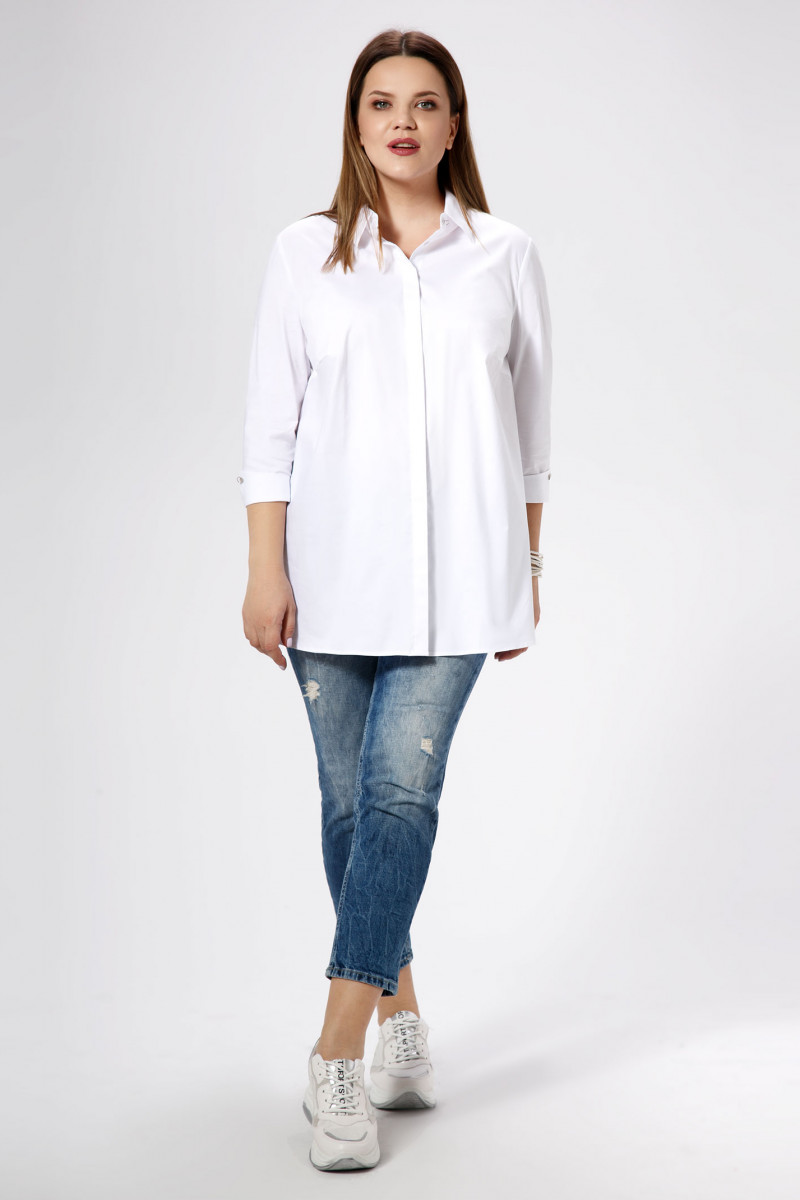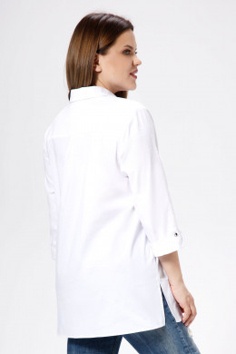 Лаконичная и строгая блузка из хлопковой ткани – отличный вариант для офиса. Блузка полуприлегающего силуэта слегка расширенная к низу, по бокам имеются небольшие разрезы. Блузка с центральной сквозной застежкой на потайные петли и пуговицы и одну декоративную пуговицу на стойке воротника. По переду имеются нагрудные выточки, по спинке имеется кокетка, от кокетки - небольшая сборка, что обеспечивает особый комфорт. Рукава длиной чуть ниже локтя, с отложными манжетами. На манжетах имеются декоративные петли и пуговицы. Такая блузка отлично сочетается с различными брюками, джинсами, сарафанами, создавая стильный современный образ.