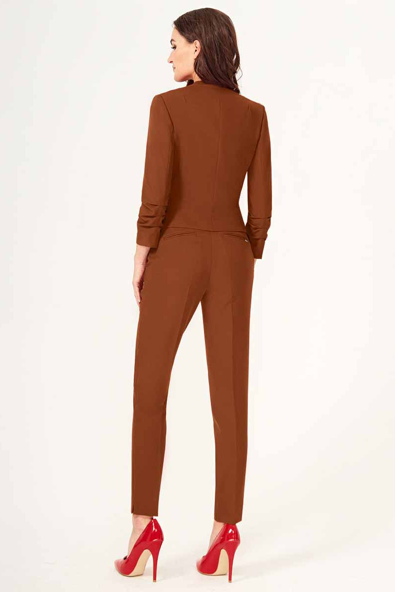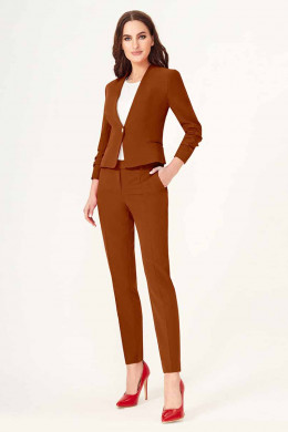 Стильный лаконичный брючный костюм. Жакет с застежкой на одну пуговицу. Жакет полуприлегающего силуэта, с V-образным вырезом горловины. По переду и по спинки имеются вытачки и рельефы, которые обеспечивают отличную посадку изделия по фигуре. Рукава втачные, длиной 3/4. Брюки классические на поясе, укороченые, с карманами по переду. Отличный вариант как для деловых встреч, так и для торжественных мероприятий.