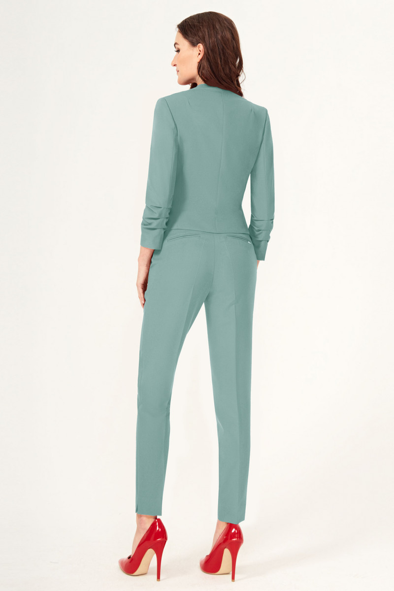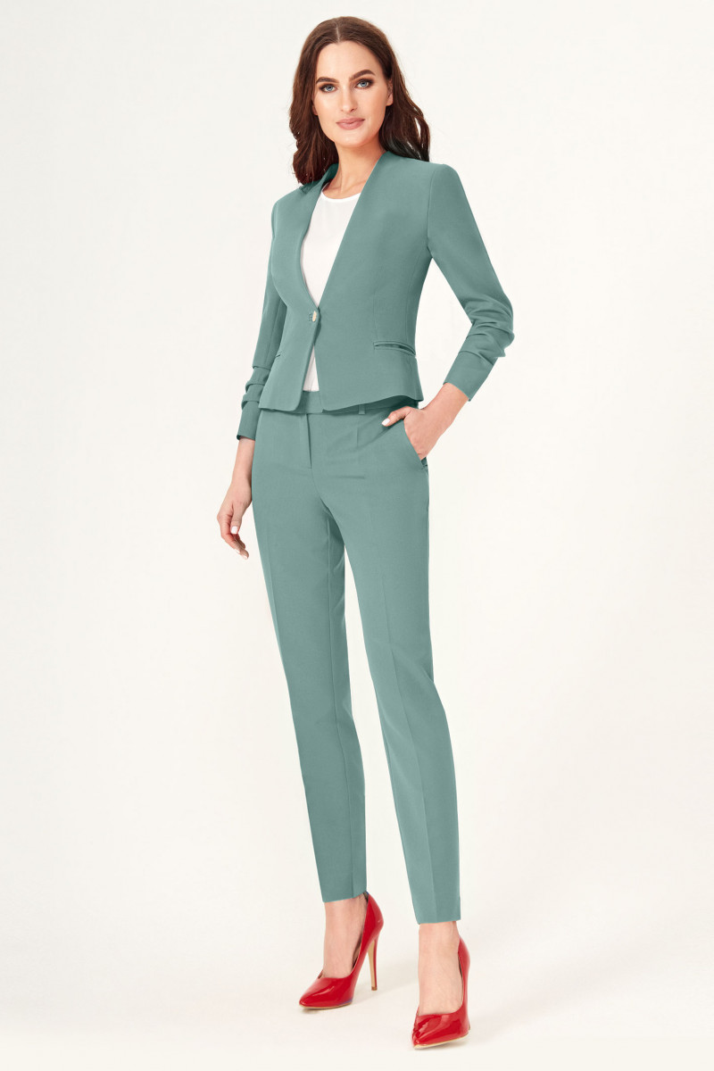 Стильный лаконичный брючный костюм. Жакет с застежкой на одну пуговицу. Жакет полуприлегающего силуэта, с V-образным вырезом горловины. По переду и по спинки имеются вытачки и рельефы, которые обеспечивают отличную посадку изделия по фигуре. Рукава втачные, длиной 3/4. Брюки классические на поясе, укороченые, с карманами по переду. Отличный вариант как для деловых встреч, так и для торжественных мероприятий.