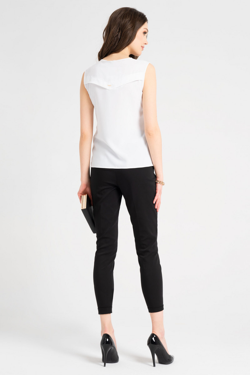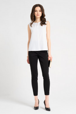 Блузка из струящейся шифоновой ткани. Блузка прямая, свободного покроя, без воротника, с круглым вырезом горловины, по бокам имеются небольшие разрезы. По переду в среднем шве декоративный разрез, с застежкой на воздушную петлю и пуговицу. Блузка без рукава. По спинке фигурная кокетка. Отлетный базовый вариант блузки для офиса.