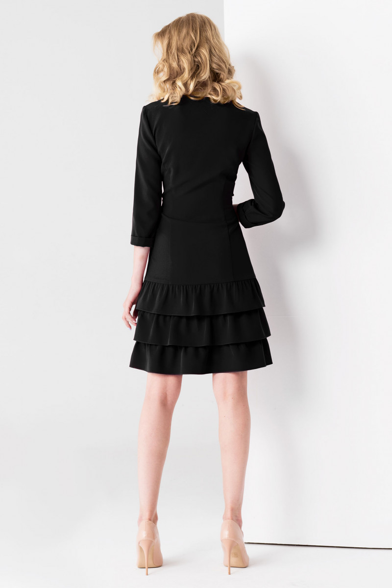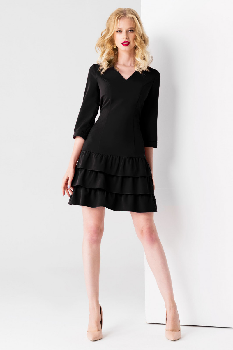 А-силуэт с рельефами по переду и спинке обеспечивает идеальную посадку по фигуре. Платье женское с V-образным вырезом акцентирует на красивых линиях шеи, ключиц. Втачные рукава 3/4 оканчиваются манжетами. Нарядное платье с пышными притачными воланами не обтягивает тело, а подчеркивает тонкую талию, открывает стройные ножки. Оно смотрится элегантно и женственно, придает образу утонченность.