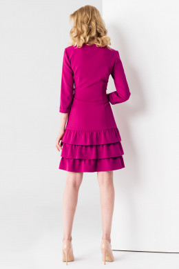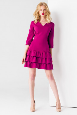 А-силуэт с рельефами по переду и спинке обеспечивает идеальную посадку по фигуре. Платье женское с V-образным вырезом акцентирует на красивых линиях шеи, ключиц. Втачные рукава 3/4 оканчиваются манжетами. Нарядное платье с пышными притачными воланами не обтягивает тело, а подчеркивает тонкую талию, открывает стройные ножки. Оно смотрится элегантно и женственно, придает образу утонченность.