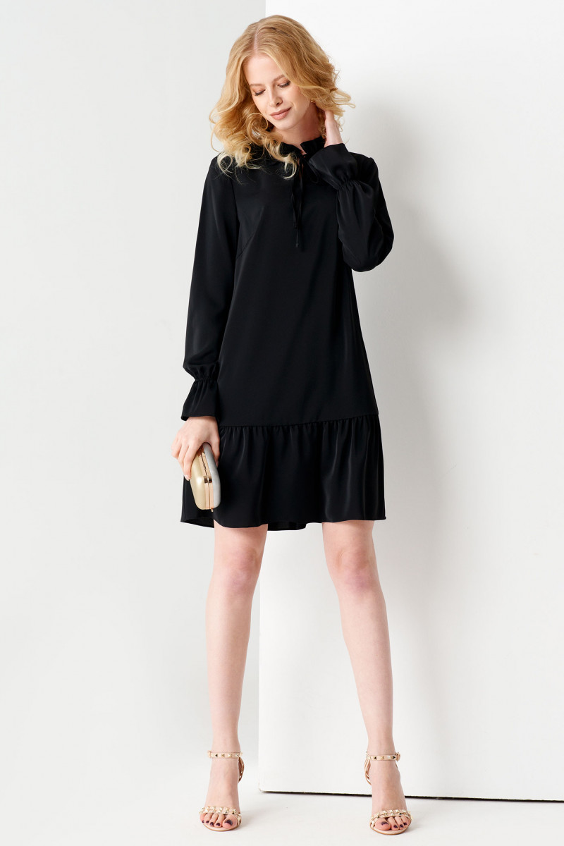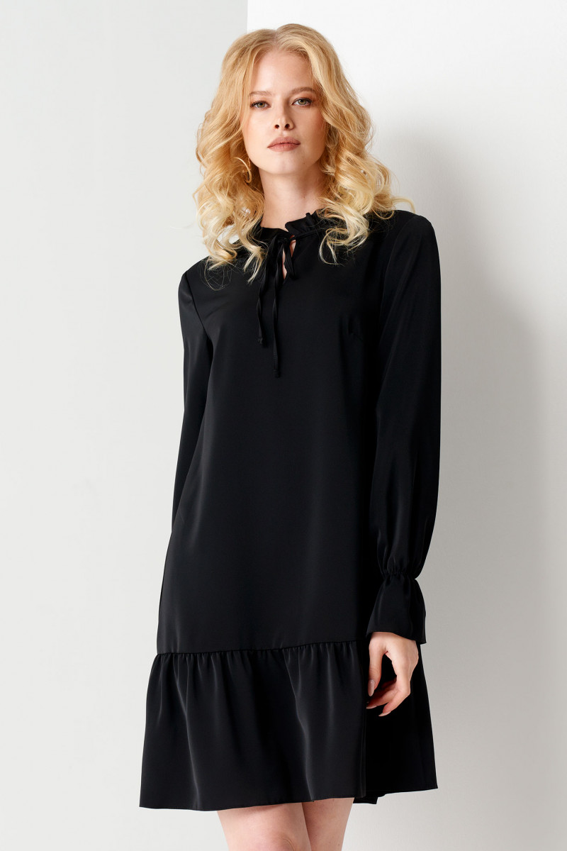 Платье черное женское с нагрудными вытачками создают полуприталенный силуэт, постепенно расширяющий к низу. Платье женское с длинным рукавом и завязками у горловины подчеркнет грациозные линии шеи.