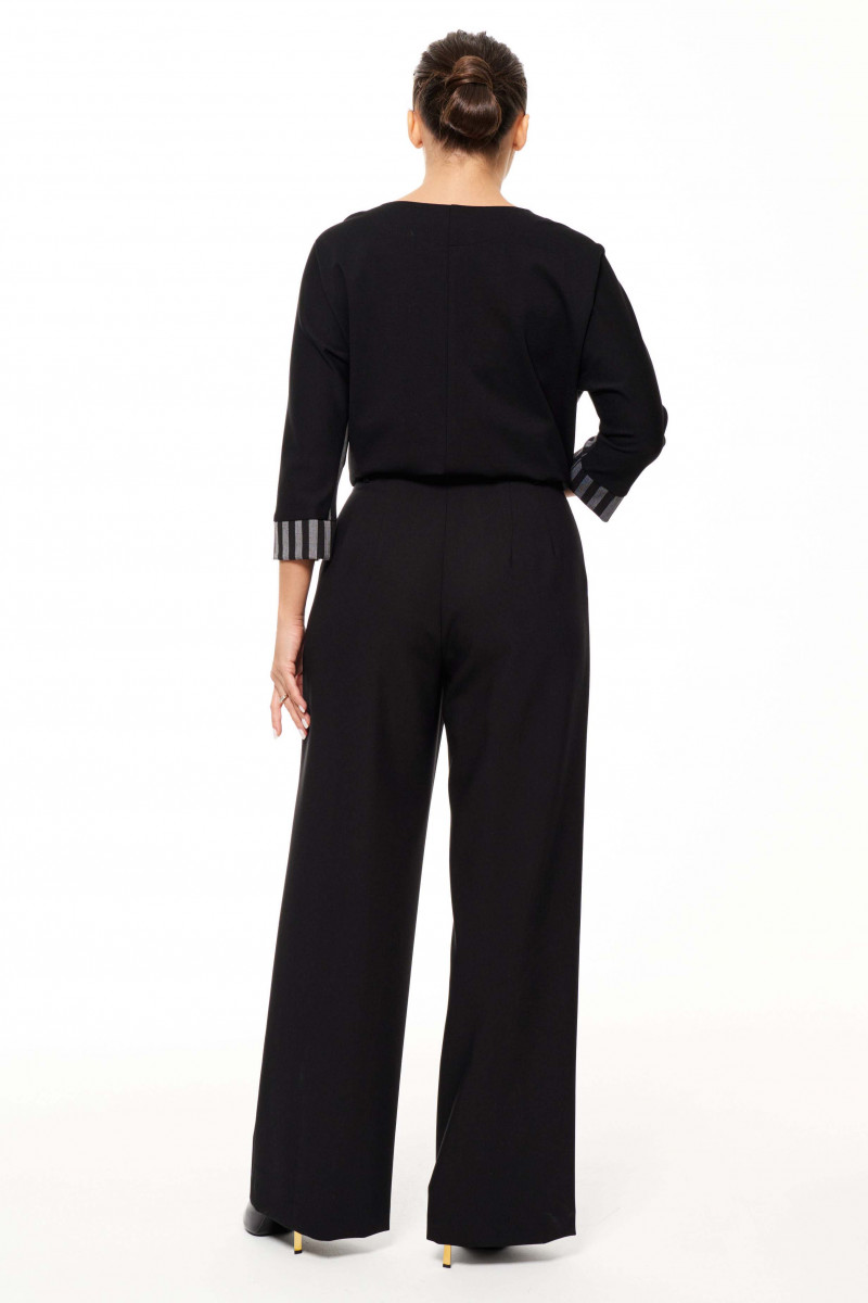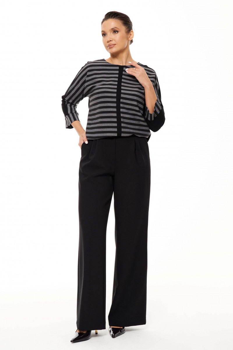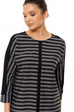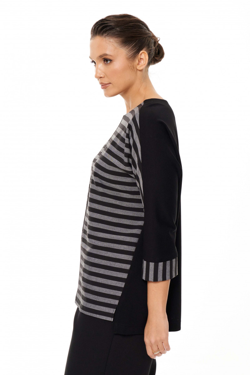 Стильный и практичный джемпер идеально подойдёт как вариант на каждый день в офис и для выхода в город. Текстильный спереди и трикотажный сзади он не сковывает движений ,стройнит и выгодно подчёркивает фигуру. Графичная полоса в ткани по преду добавляет образу остроту и выразительность. Рукава цельнокроеные с отрезным манжетом по низу. Плечевой шов смещён на переднюю часть. Боковой срез также смещён на перед.что визуально стройнит фигуру.По переду выполнен вертикальный средний шов,в котором оформлена узкая однотонная планка. Спинка длиннее переда.