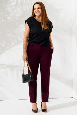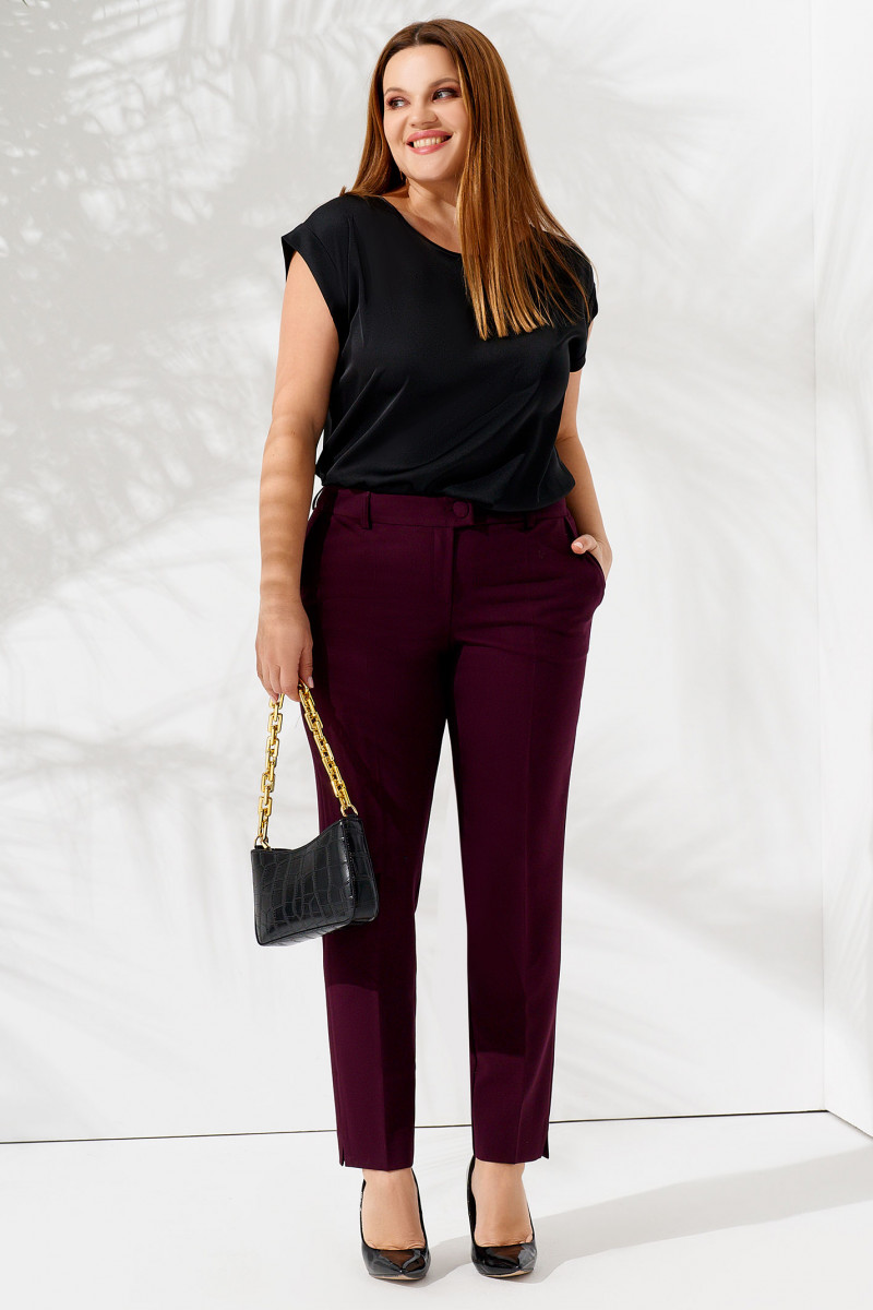 Женские брюки большого размера в благородном бордовом оттенке сшиты из плотной, износостойкой ткани на основе полиэстера, вискозы и эластана. Материал отлично держит форму, не мнется и не растягивается со временем.