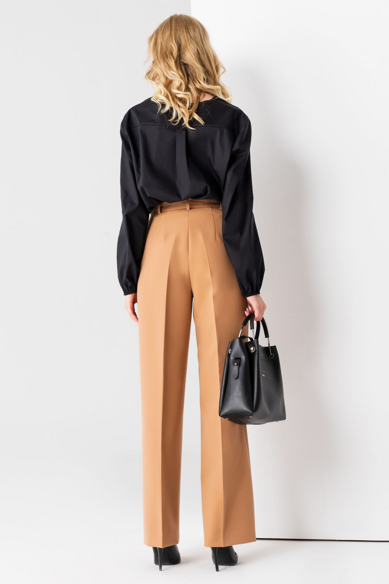 Брюки женские классические с высокой талией идеально садятся по фигуре, благодаря особенностям кроя. От пояса в передней части опускаются защипы и стрелки, в задней - талиевые вытачки. В боковых швах - прорезные карманы.
