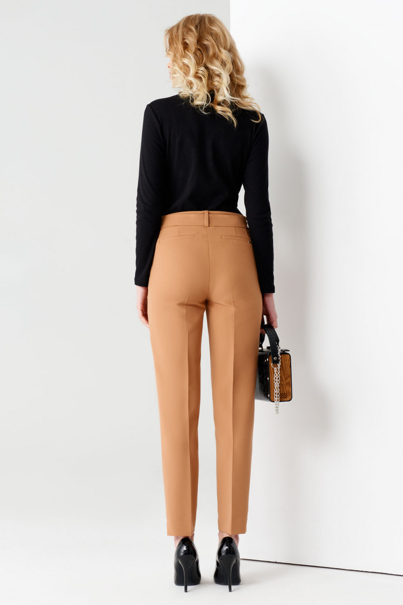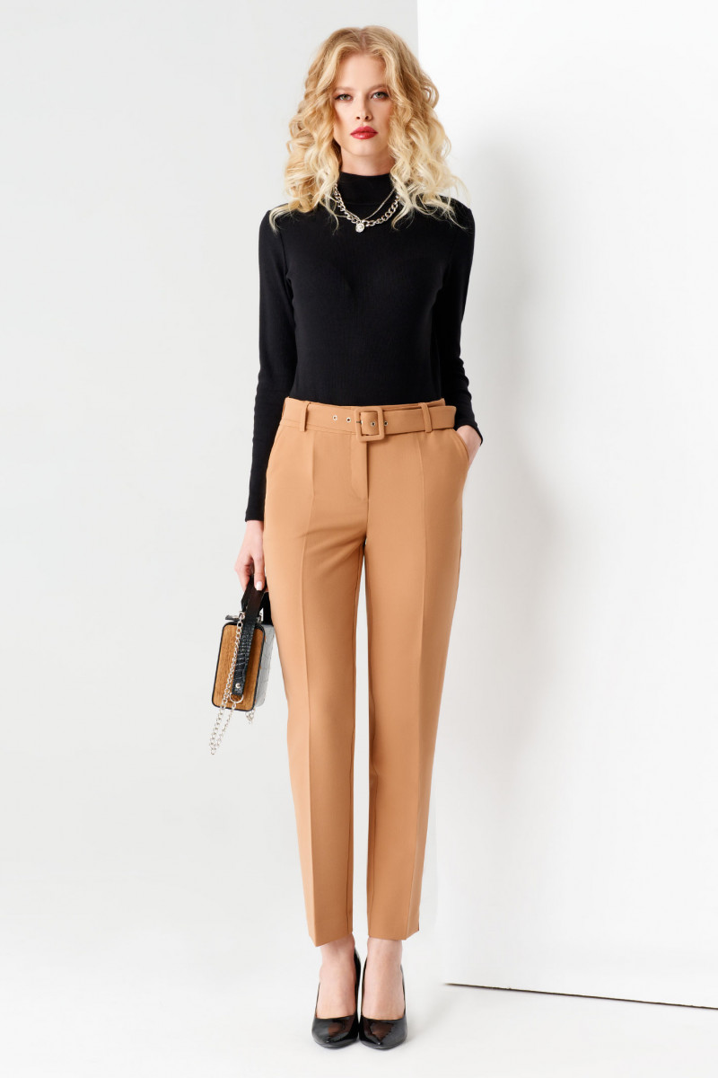 Брюки женские органично выглядят в аутфитах с пиджаком, курткой, жакетом, кардиганом. Такие комбинации помогут вам создавать привлекательные элегантные образы на каждый день в прохладное время года. Зауженные брюки безупречно садятся по фигуре, благодаря высокой посадке. Стрелки визуально удлиняют и стройнят ноги. Линия пояса – отрезная, с традиционной молнией, скрытой гульфиком и пуговицей. Трикотажные брюки дополнены боковыми прорезными карманами и поясом с пряжкой, заправленным в шлевки.