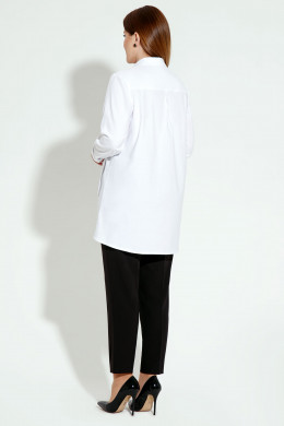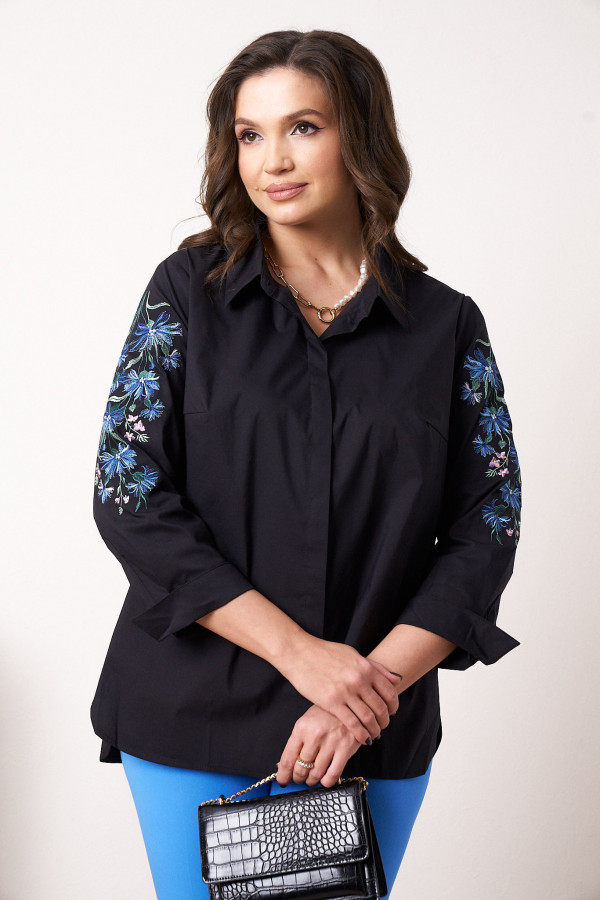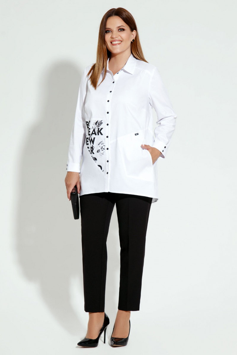 Стильная блузка оригинального кроя выполнена из хлопковой блузочной ткани с добавлением эластана.Она сочетает в себе одновременно нарядность и строгую сдержанность По горловине выполнен сорочечный воротник на стойке и застёжка центральная спереди на петли и пуговицы. По переду и по спинке выполнены отрезные кокетки.Рукав втачной ,с отложным манжетом по низу,декорированным пуговицами. Длина рукава 3/4. По переду от кокетки выполнены два защипа.По спинке оформлена встречная складка. Также спереди выполнены эффектные конструктивные членения. Оформлен вход в карман и графичный принт. Сзади блузка удлинена. Прекрасный вариант блузки на каждый день и в офис для стильной современной женщины.