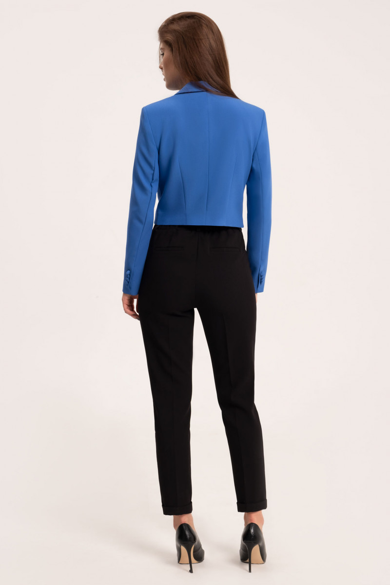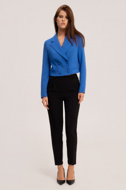 Двубортный жакет женский на пуговицах, обшитых в цвет ткани, оформлен боковыми декоративными рамками. Они имитируют форму нагрудных карманов с листочкой. Длинные втачные рукава со шлицей и пуговицей.