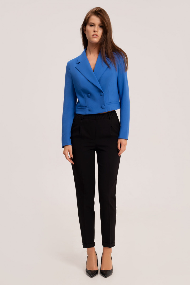 Элегантный жакет женский - модная вещь для работы и особых случаев. Укороченные жакеты стали хитом сезона, и эта модель не исключение! Приталенный жакет женский трикотажный с английским воротником позволит создать стильные и женственные образы с юбками, широкими брюками, кожаными шортами и даже джинсами.