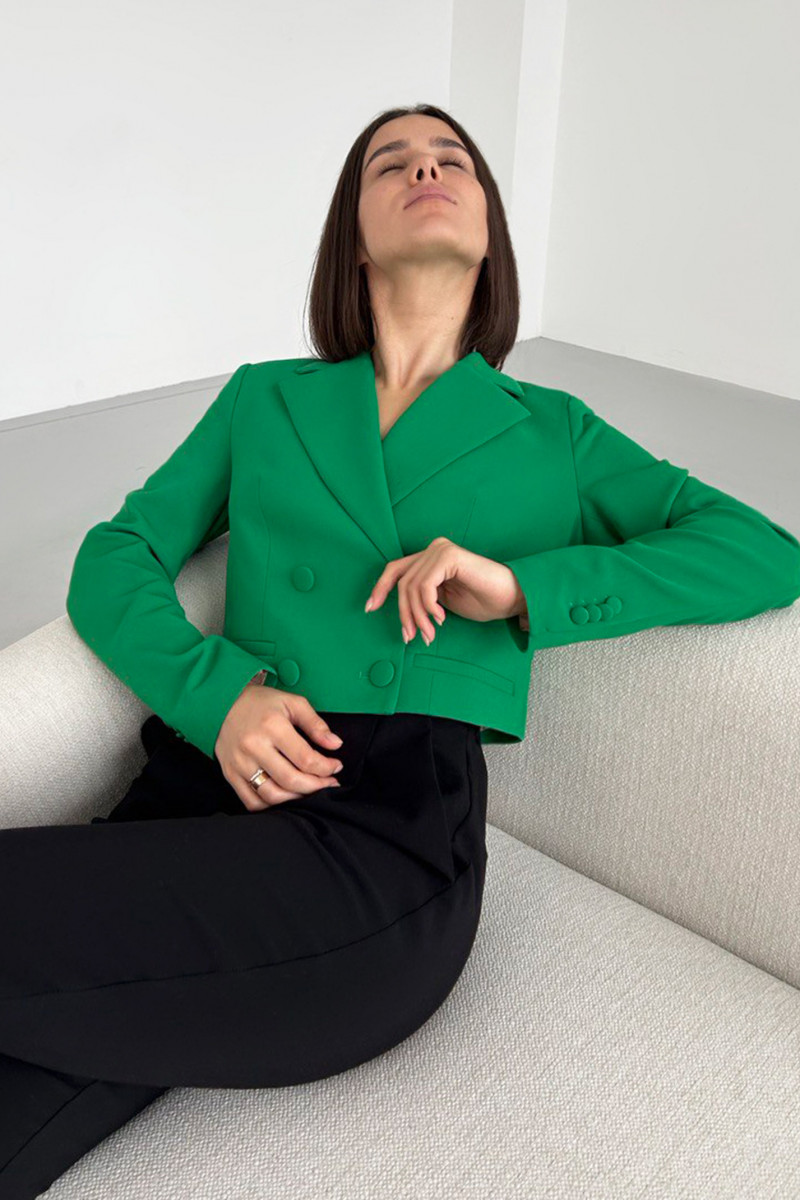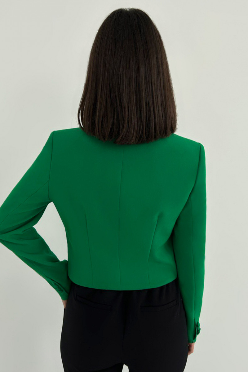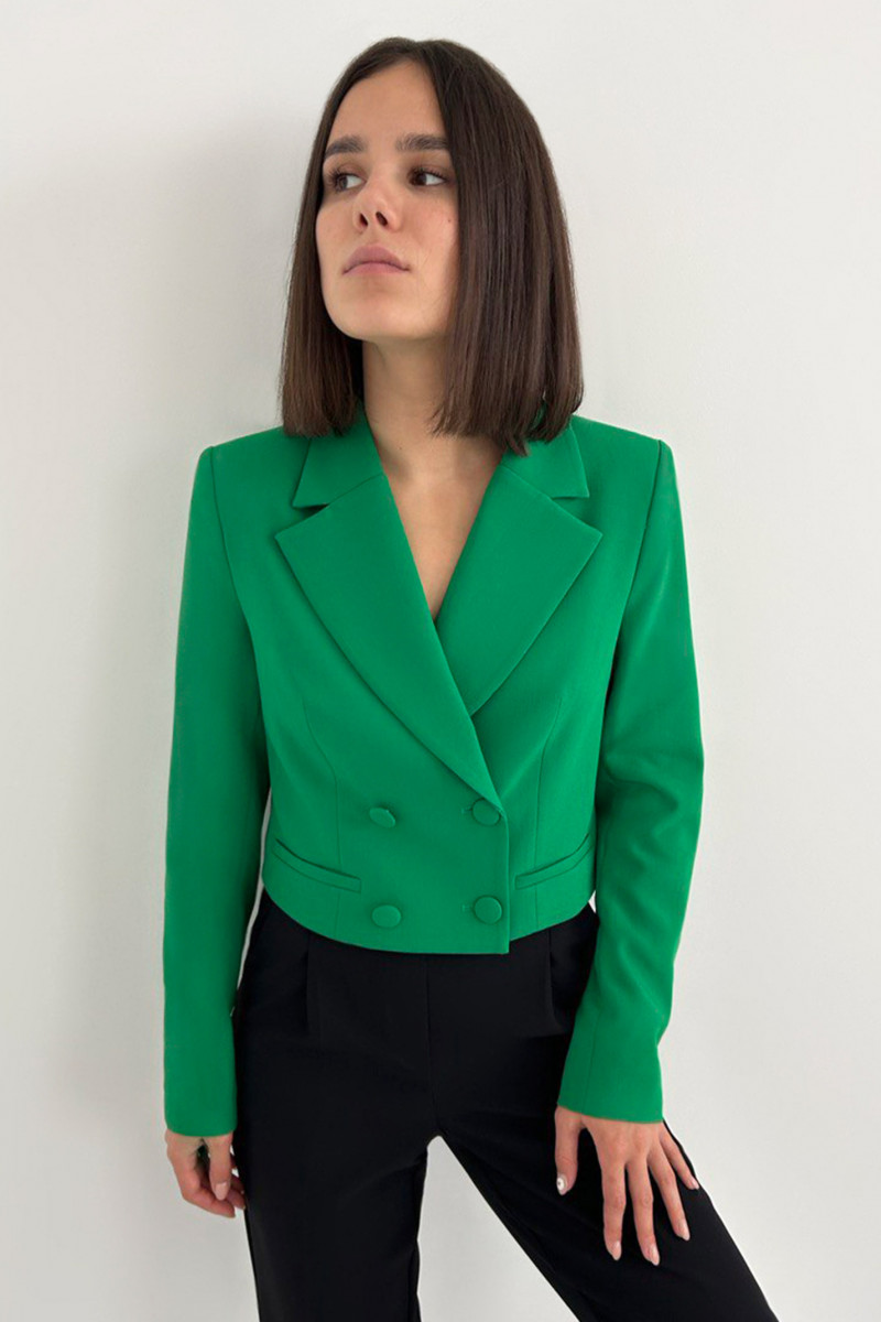 Двубортный жакет женский на пуговицах, обшитых в цвет ткани, оформлен боковыми декоративными рамками. Они имитируют форму нагрудных карманов с листочкой. Длинные втачные рукава со шлицей и пуговицей.