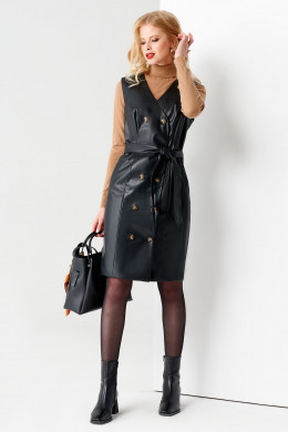 Платье трикотажное женское скроено без рукава, с рельефными швами по линии переда и спинке. Они обеспечивают безупречную посадку, подчеркивают достоинства силуэта. Платье с запахом скрепляется центральной двубортной застежкой с петлями-пуговицами. Модель дополнена прорезными боковыми карманами с листочкой. Платье женское короткое открывает колени, акцентируя внимание на стройность ног.