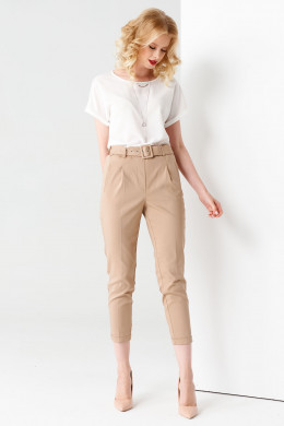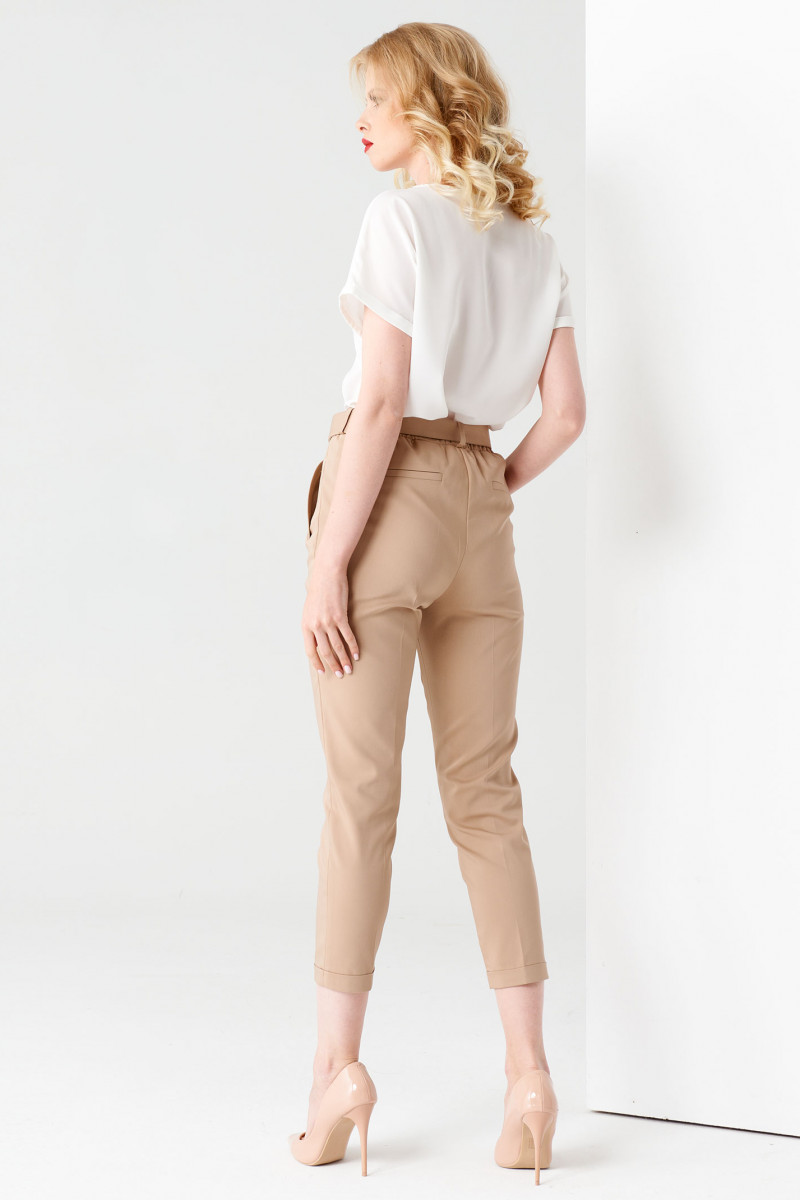 Стильные молодежные брюки из хлопковой ткани. Брюки на талии на резинке. По поясу имеются маленькие декоративные складочки. По бокам карманы. Низ брюк с манжетами, брюки укороченные. Данные брюки дополнены съёмным поясом из основной ткани. Отличный вариант брюк для повседневных летних дней.