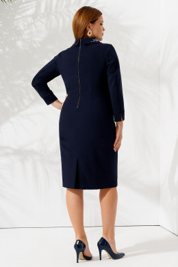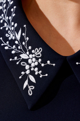 Платье деловое женское дополнено отложным воротничком, декорированным нежной флористической вышивкой. Рукав 3/4 с манжетами открывает изящные запястья. Платье женское офисное в передней части дополнено прорезными карманами, прикрытыми сверху клапанами.