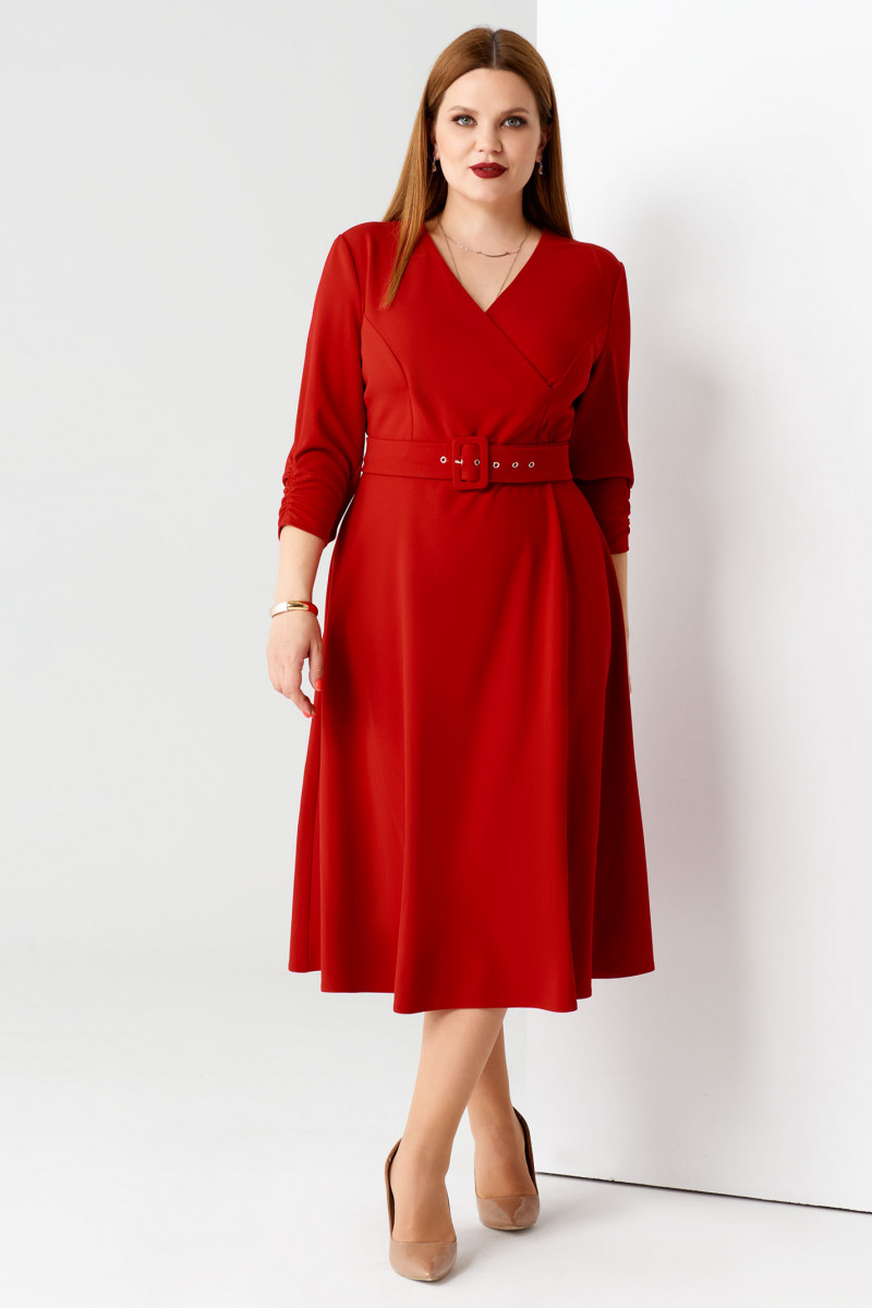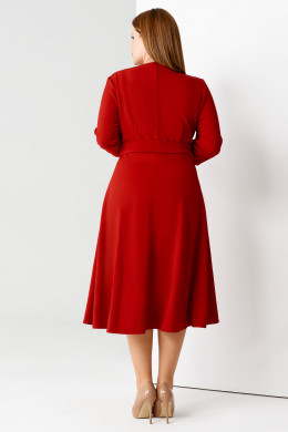 Нарядное платье из очень эластичной ткани. Платье отрезное по талии, нижняя часть платья юбка расширенная. Лиф платья имитирует запах, имеет рельефные швы, идущие от проймы до подреза по талии. Рукава длиной чуть ниже локтя, по низу декоративная сборка. Платье дополнено съёмным поясом на пряжку из основной ткани. Отличный нарядный вариант платья.