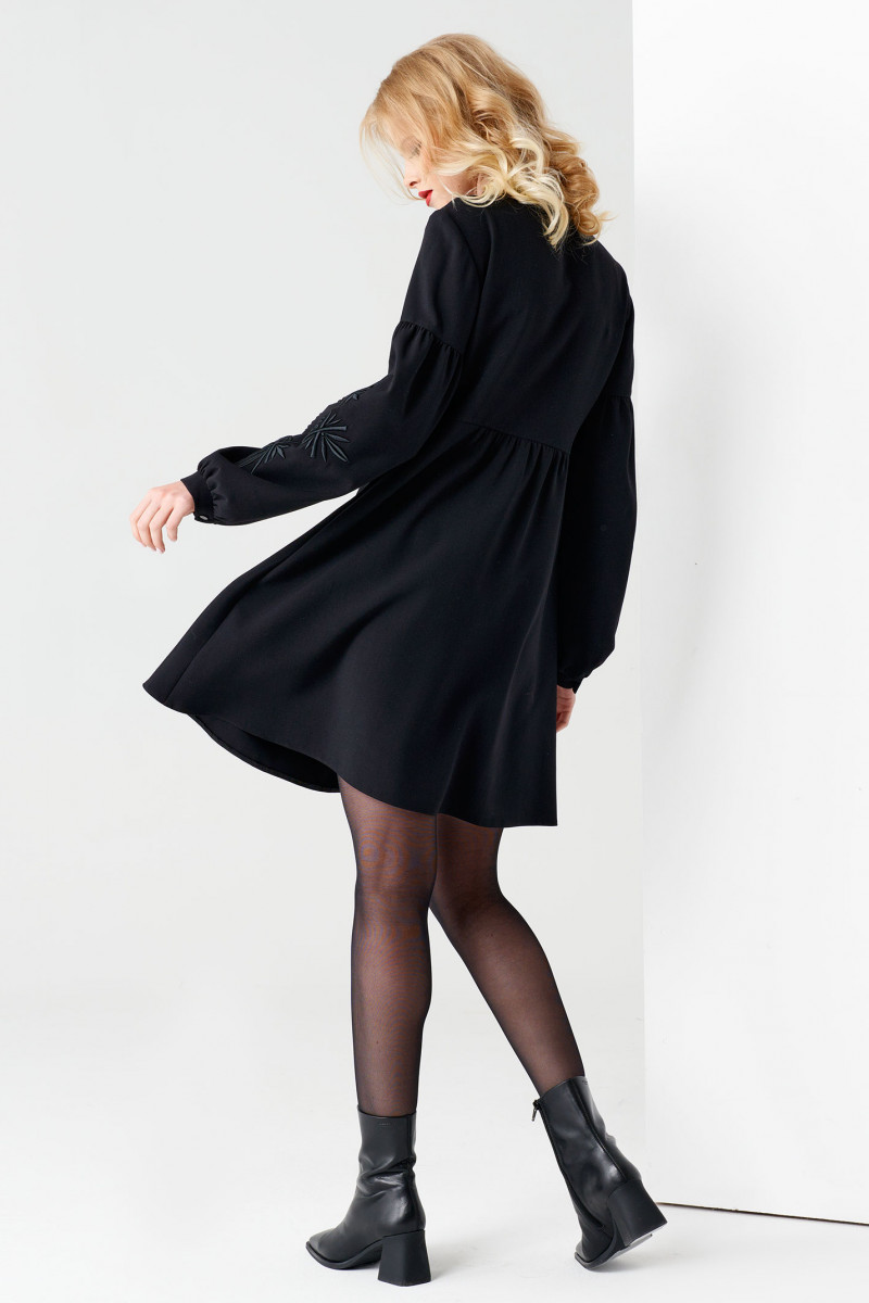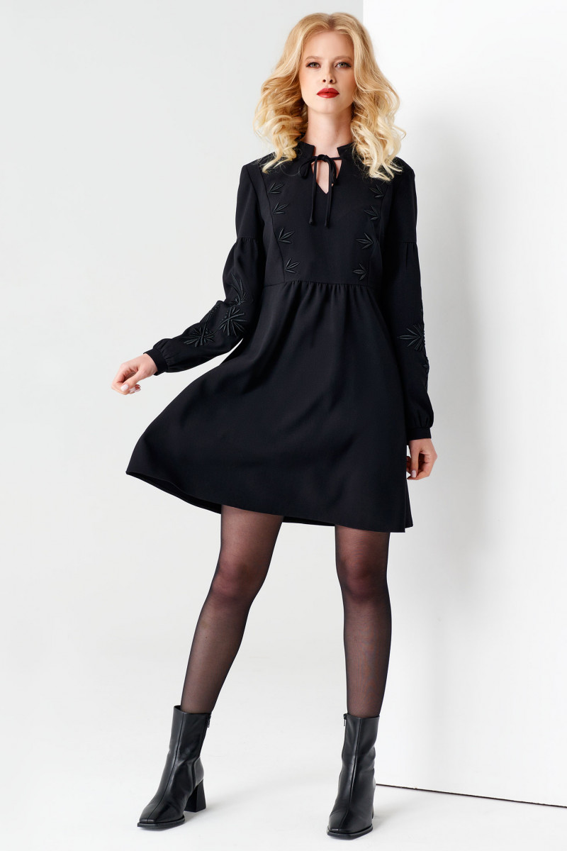 Маленькое черное платье говорит само за себя. Платье полуприлегающего силуэта в верху и расширенное к иизу, акцент сделан на дизайнерскую вышивку на кокетке и рукавах, вышивка в тон платья, со стойкой и узкой лентой по горловине при желании можно завязать романтичный бантик, отрезное ниже линии груди, нижняя деталь платья расширенная. Спинка с подрезом. Рукава длинные к низу расширенные с дизайнерской вышивкой, на тонком манжете на одну петлю пуговицу. Вы уже - идеал для подражания, шикарный образ как по случаю так и без него. Легкость, романчтичность, очаровательность- это то, что объединяет обладательницу этого платья .