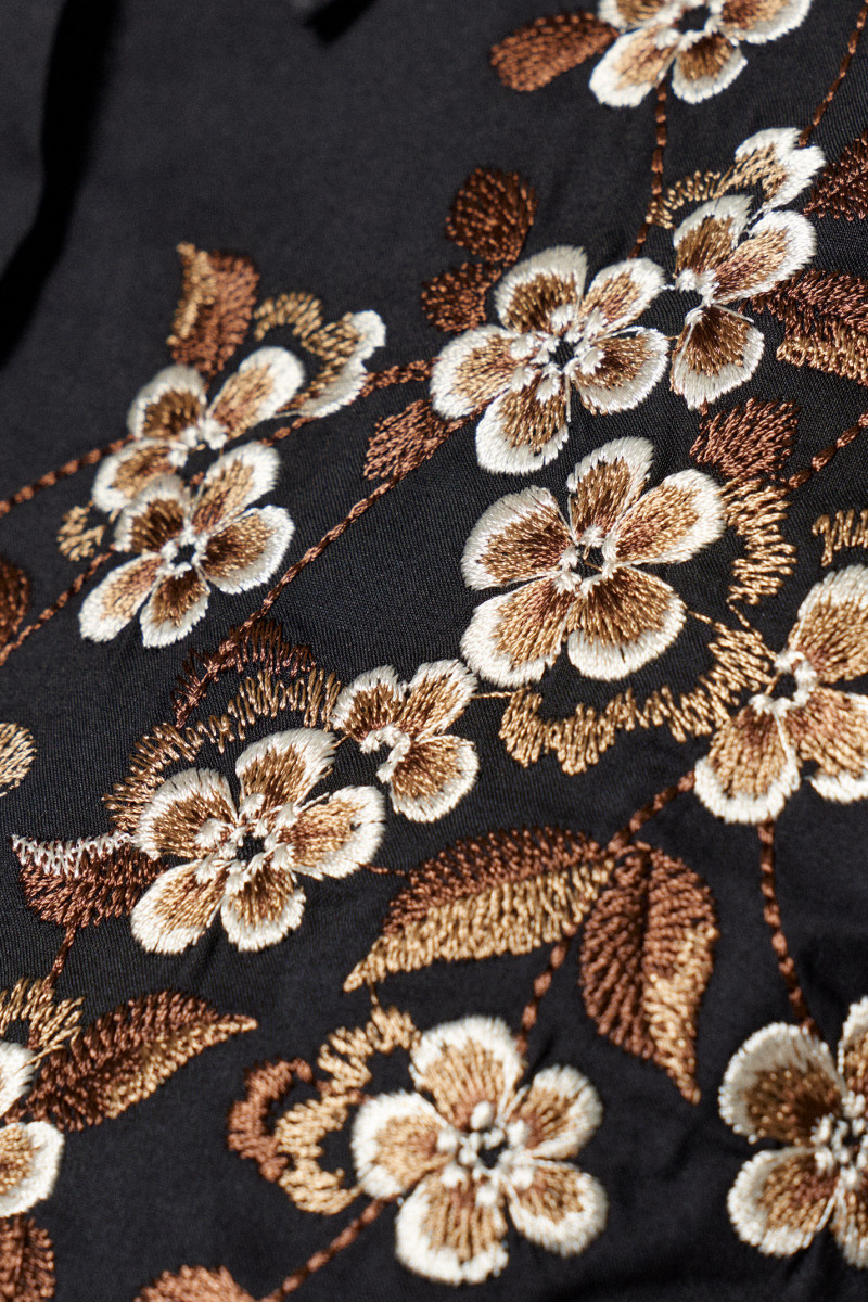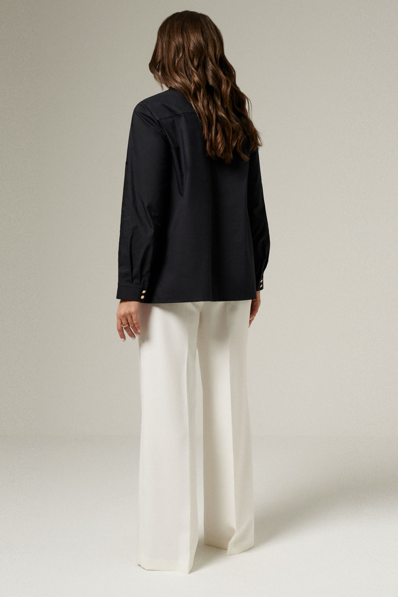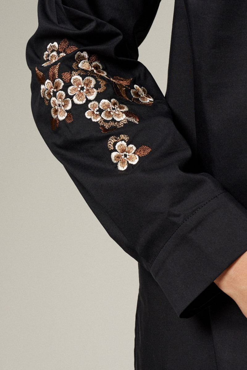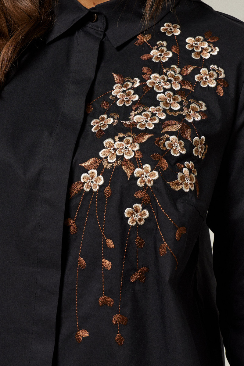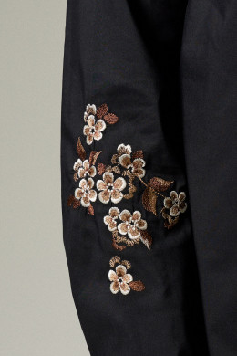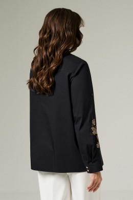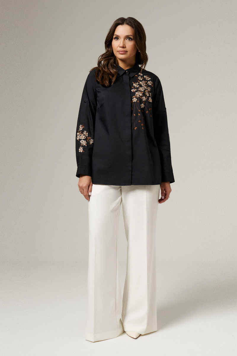 Стильная молодежная блузка с дизайнерской вышивкой по переду и по рукаву. Такая блузка отличный вариант как для офиса, так и на каждый день. Блузка полуприлегающего силуэта, слегка расширенная к низу, по бокам имеются небольшие разрезы. Блузка с центральной сквозной застежкой на потайные петли и пуговицы и одну декоративную пуговицу на стойке воротника. По переду имеются нагрудные вытачки, по спинке имеется кокетка. Рукава длинные с манжетами. На манжетах имеются декоративные петли и пуговицы. Такая блузка отлично сочетается с различными брюками и джинсами создавая стильный современный образ.