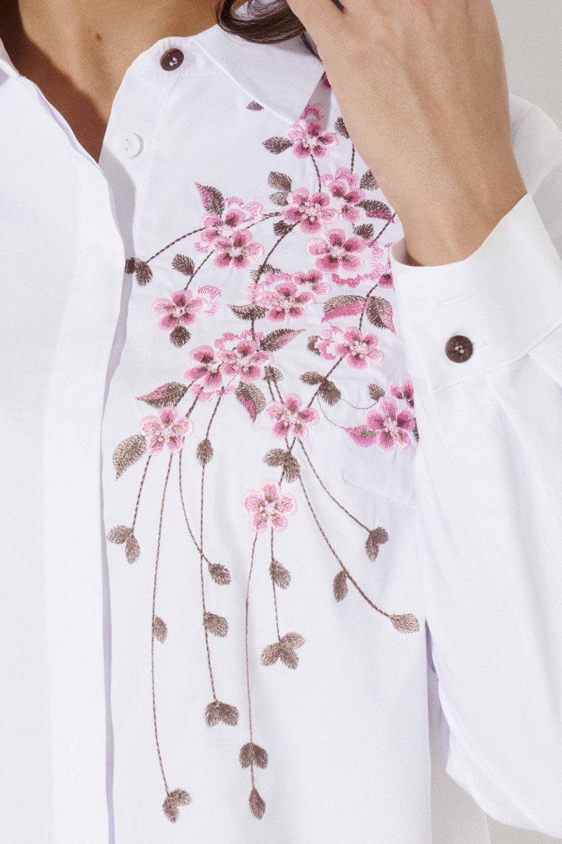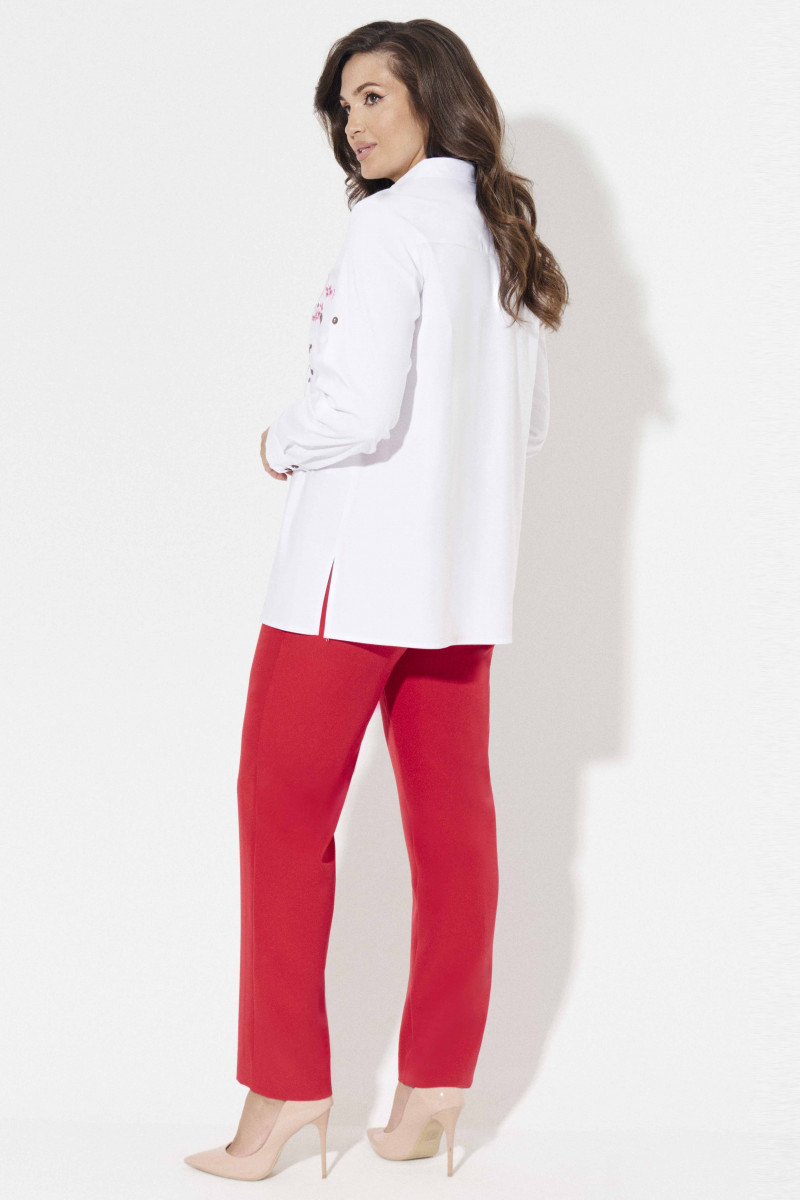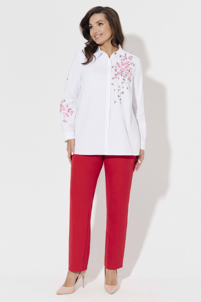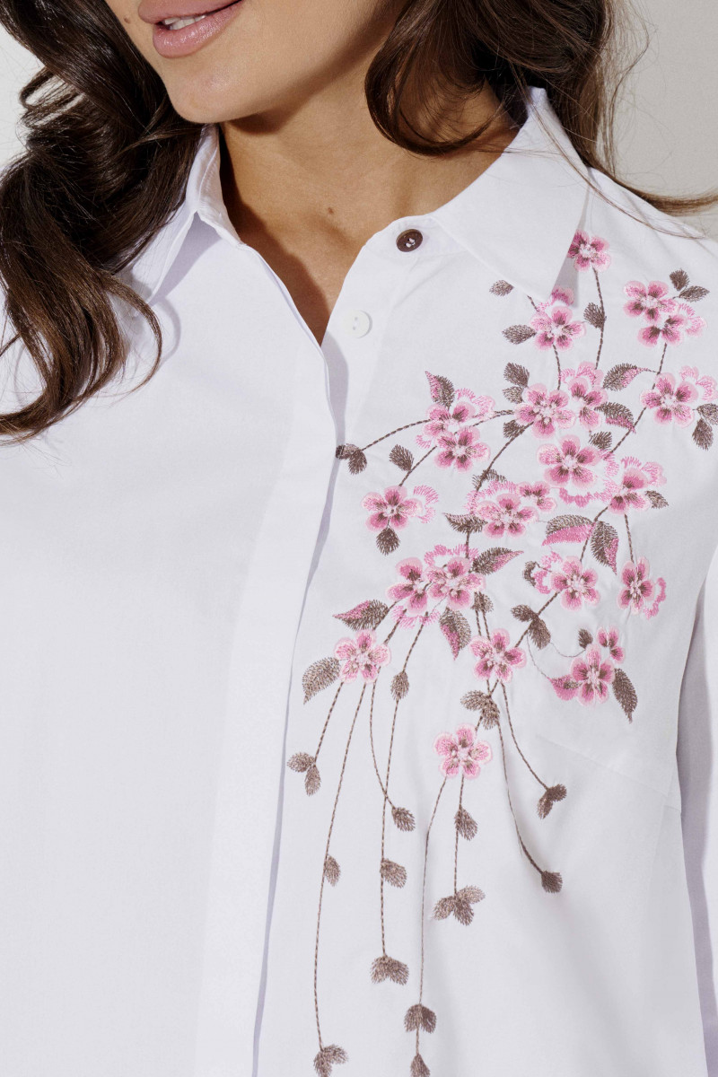 Стильная молодежная блузка с дизайнерской вышивкой по переду и по рукаву. Такая блузка отличный вариант как для офиса, так и на каждый день. Блузка полуприлегающего силуэта слегка расширенная к низу, по бокам имеются небольшие разрезы. Блузка с центральной сквозной застежкой на потайные петли и пуговицы и одну декоративную пуговицу на стойке воротника. По переду имеются нагрудные вытачки, по спинке имеется кокетка. Рукава длинные с манжетами. На манжетах имеются декоративные петли и пуговицы. Такая блузка отлично сочетается с различными брюками и джинсами создавая стильный современный образ.