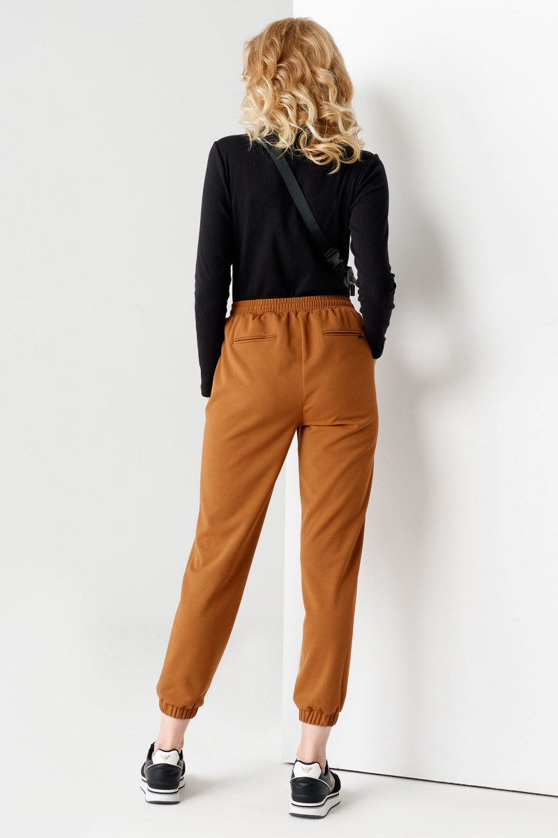 Комфортные стильные брюки из очень эластичной ткани. Брюки на талии на резинке по поясу. По бокам карманы. Низ брюк с манжетами на резинке. На задних частях брюк карманы. Отличный вариант на каждый день.