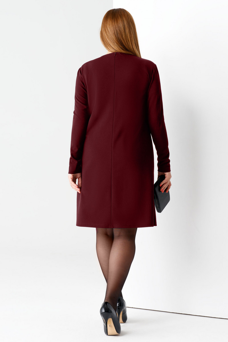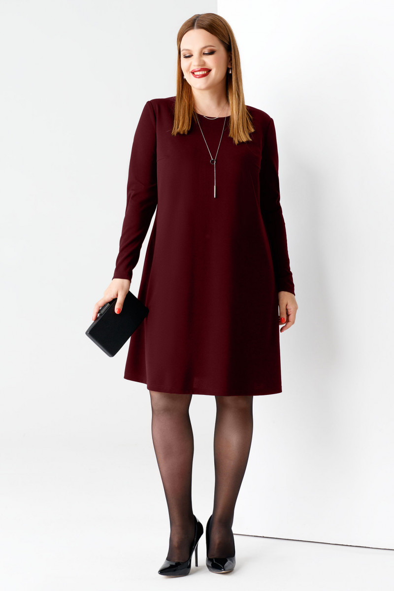 Офисное платье создано в свободном, расширенном фасоне. Оно не обтягивает силуэт, изысканно маскируя его несовершенства. Изделие скроено с округлым вырезом горловины и длинным втачным рукавом, изящно открывающим красивые запястья. Платье женское длиной до колена без проблем скроет массивные бедра, акцентируя внимание на стройных голенях.