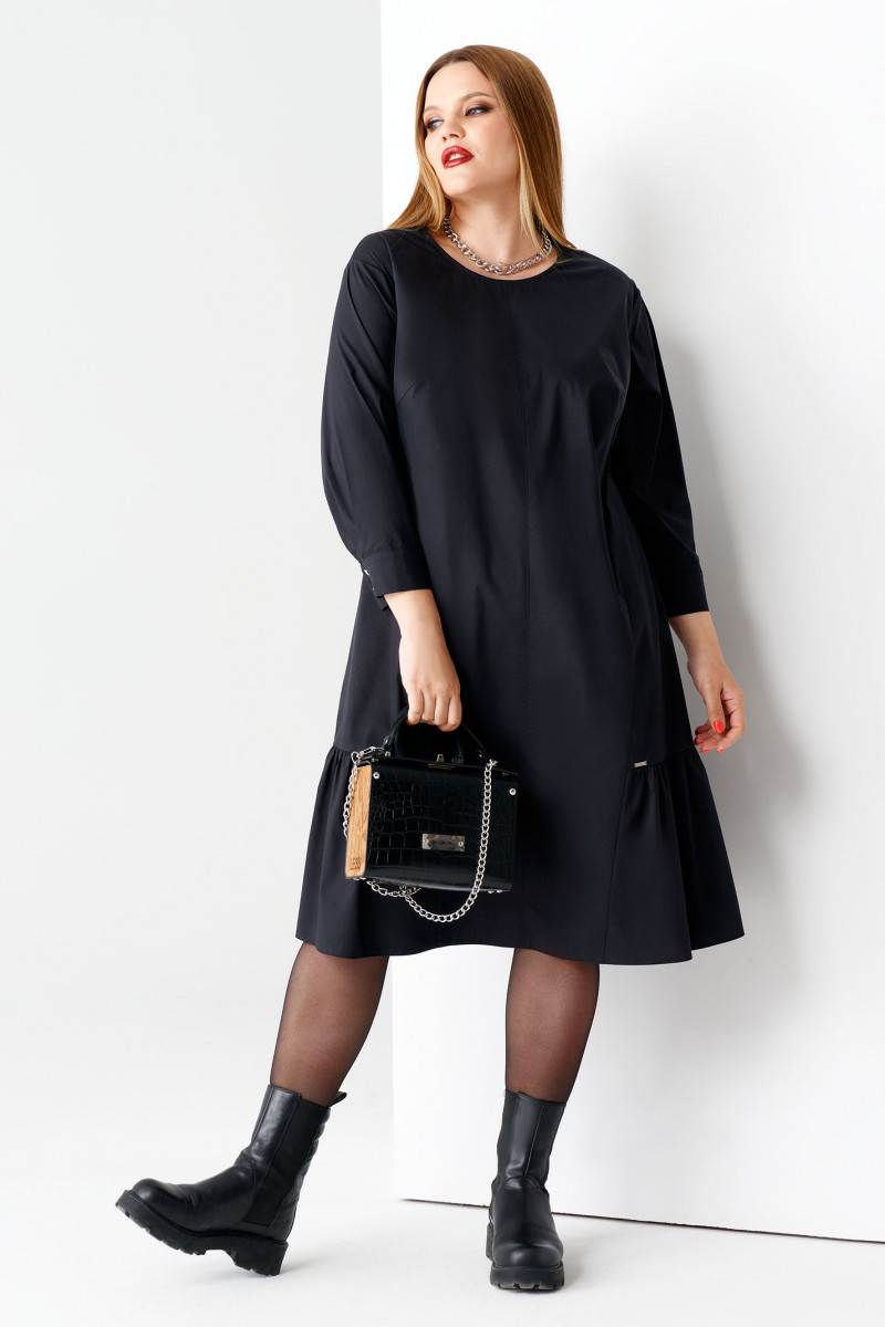 Платье больших размеров для женщин не выглядит громоздким. Свободный крой скроет от глаз окружающих несовершенства фигуры, подарит движениям легкость. Этому способствуют рельефные швы спереди, дополненные прорезными карманами, округлый вырез горловины, широкая рюша с мягкими складками по подолу. Платье миди с длинным рукавом 7/8 имеет оптимальную длину- ниже колена. Оно превосходно смотрится с обувью на низком ходу, каблуках.