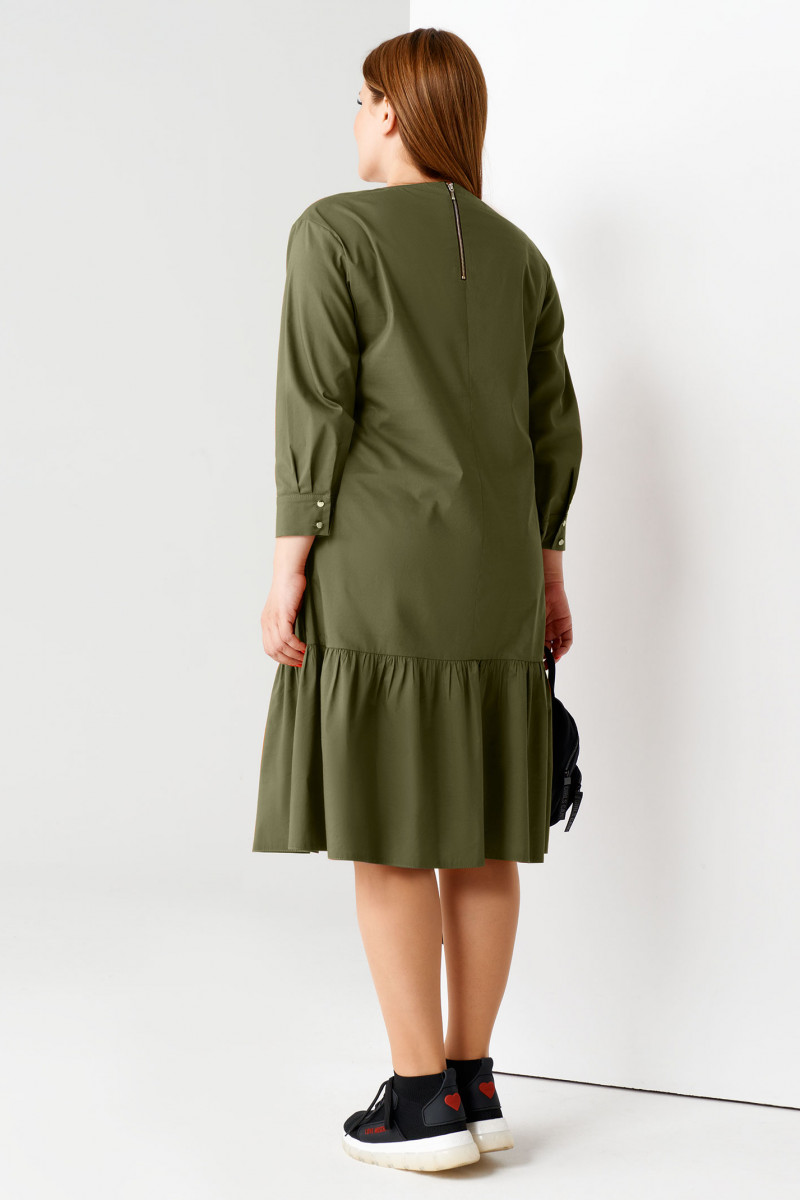 Платье больших размеров для женщин не выглядит громоздким. Свободный крой скроет от глаз окружающих несовершенства фигуры, подарит движениям легкость. Этому способствуют рельефные швы спереди, дополненные прорезными карманами, округлый вырез горловины, широкая рюша с мягкими складками по подолу. Платье миди с длинным рукавом 7/8 имеет оптимальную длину- ниже колена. Оно превосходно смотрится с обувью на низком ходу, каблуках.