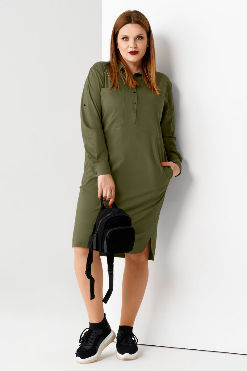 Молодежное платье из натуральной хлопковой ткани. Платье свободного кроя, с воротником, с застежкой на петли и пуговицы на планке, длиной до коленей. Рукава длинные втачные, по низу манжеты с петлями и пуговицами. В боковых швах и на груди карманы. Отличный вариант для отдыха и повседневных дней.