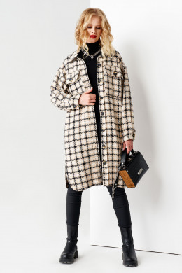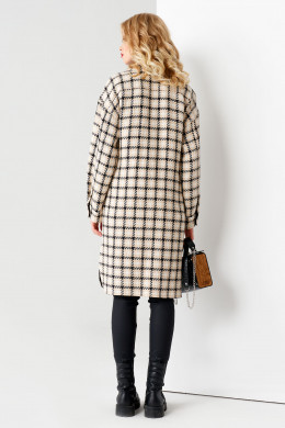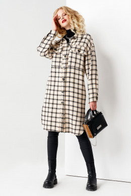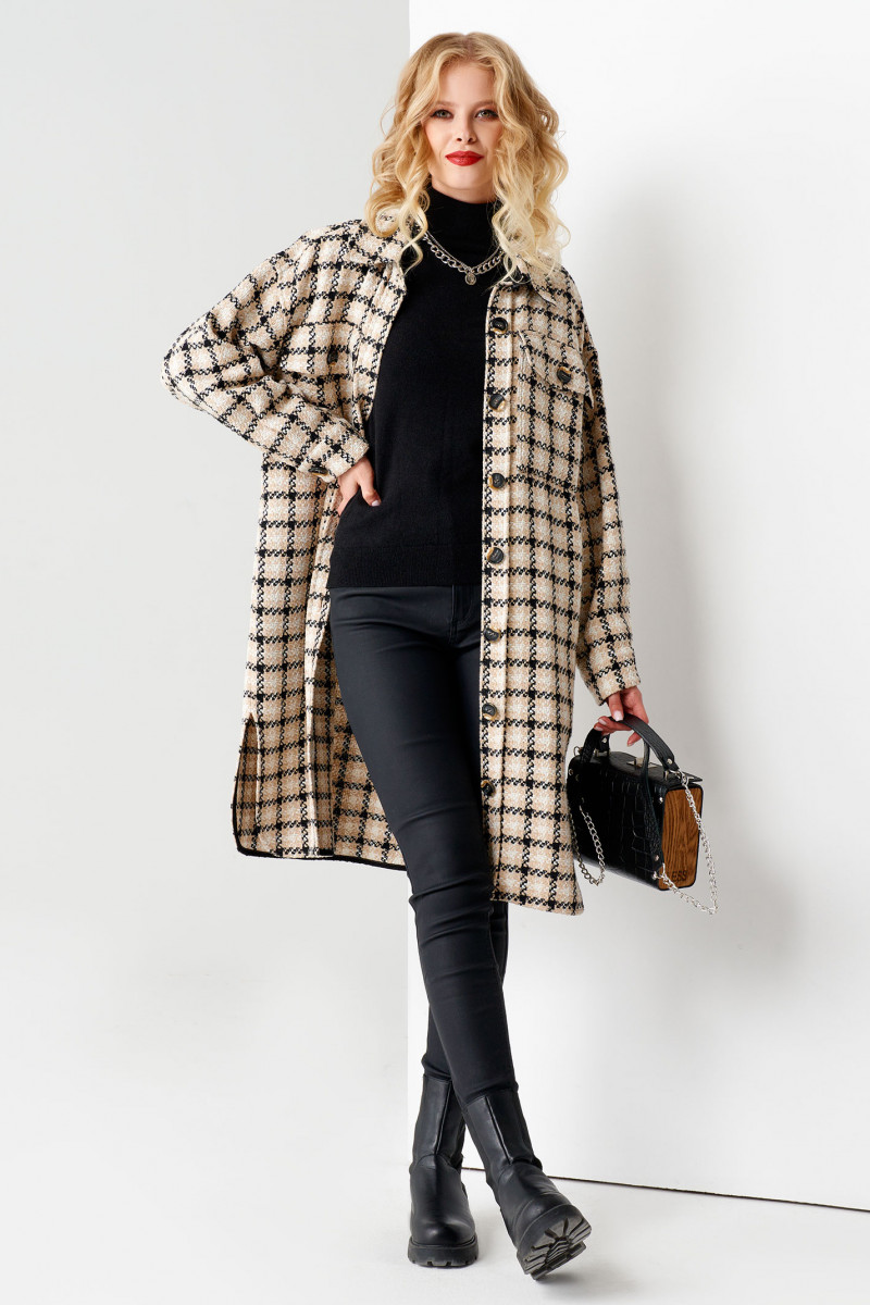 Лёгкое осеннее жакет-пальто из вискозной ткани в модную клетку. Пальто с центральной застежкой на петли и пуговицы. Пальто с длинными широкими рукавами на манжете и с большим сорочечным воротником. На передней части имеются накладные нагрудные карманы с клапаном. Низ закругленной формы, в боковых швах карманы.