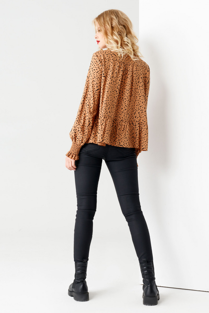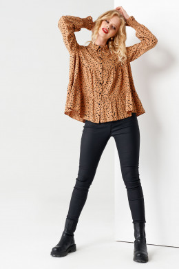 Стильная блузка свободного трапецевидного силуэта в романтическом стиле выполнена из вискозы . Рукава втачные,расширены книзу,присборены в области запястья на резинку,по низу рукава образуется рюш. Воротник рубашечного типа,отложной на стойке. Застёжка спереди центральная на петли и пуговицы. По переду и спинке выполнены горизонтальные резы с оформленными в них сборками. Прекрасная блузка на каждый день для женственной и стильной девушки.