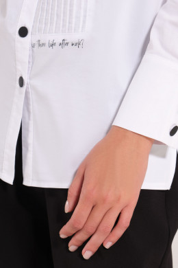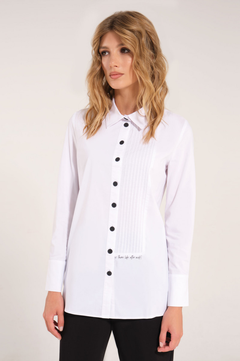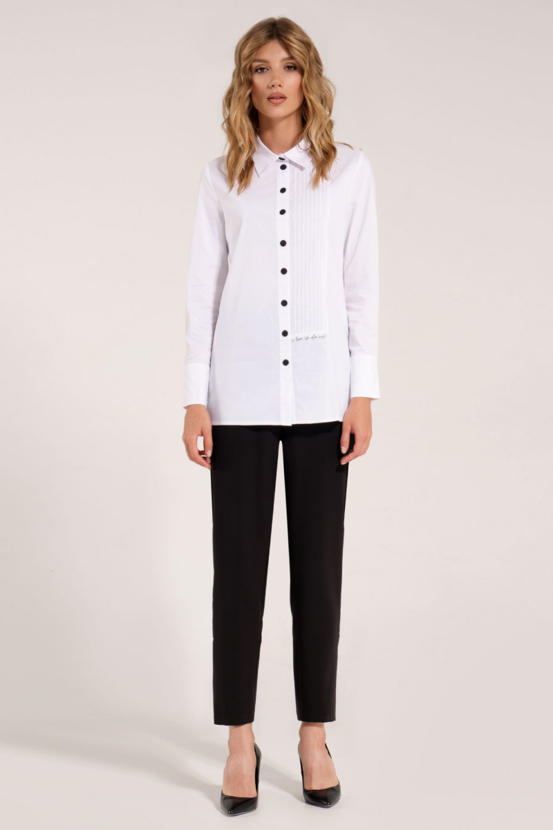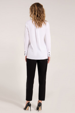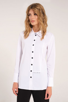 Блуза на пуговицах, с воротником рубашечного типа, украшена рядом вертикальных складок расположенных на переднем полотне. Необычный декор придает изделию оригинальный внешний вид.