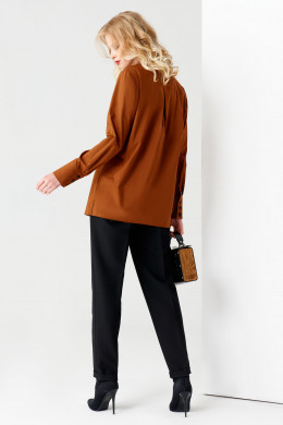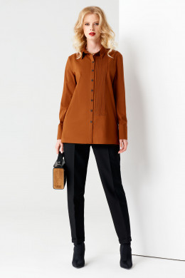 Блуза на пуговицах, с воротником рубашечного типа, украшена рядом вертикальных складок расположенных на переднем полотне. Необычный декор придает изделию оригинальный внешний вид.