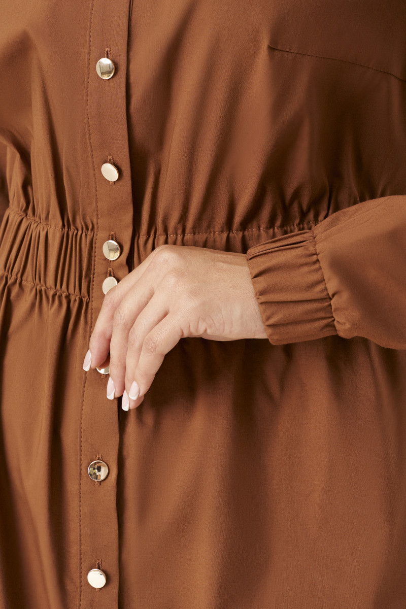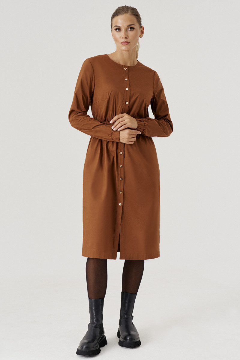 Стильное и лаконичное хлопковое платье .Лаконичное и простое по силуэту платье подчёркивает стройность фигуры. Силуэт прямий.На уровне талии и по низу рукавов оформлена широкая резинка. Застёжка спереди на планку с петлями и пуговицами. Вырез горловины круглый. В состав ткани платья входит эластан,поэтому оно удобно в эксплуатации.Эффектный вариант платья для яркой девушки,которая предпочитает в одежде стиль,минимализм и строгость.