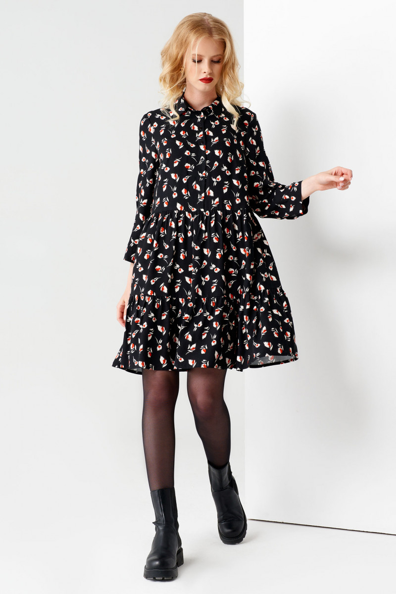 Лёгкое,невесомое вискозное платье с эффектным графичным принтом. Силуэт свободный и расширенный книзу. Воротник рубашечный ,отложной, со стойкой. Рукава втачные,длина 7/8 ,по низу есть манжет . Длину рукава можно регулировать при помощи паты. На уровне талии горизонтальный подрез. Застёжка центральная на петли и пуговицы выполнена спереди до талии. По низу выполнен отрезной валан,присборенный сверху. Платье очень комфортное и выглядит женственно и романтично. Прекрасный вариант для девушки на каждый день.