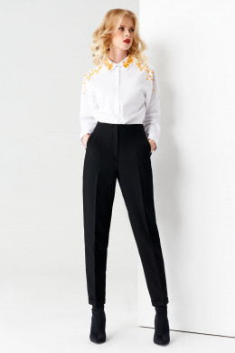 Блузка женская создана в прямом силуэте, с небольшими разрезами по бокам. Воротник рубашечного типа и линия плеч украшены восхитительной яркой дизайнерской вышивкой с флористическими мотивами. Женская рубашка застегивается на пуговицы со сквозными петлями.