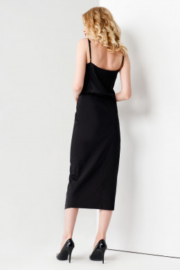 Черная женская юбка с высокой посадкой отлично сядет по фигуре, благодаря вытачкам и среднему шву на заднем полотнище. Изделие оригинально скроено. Привлекает внимание косой глубокий запах, открывающий стройные ноги.
