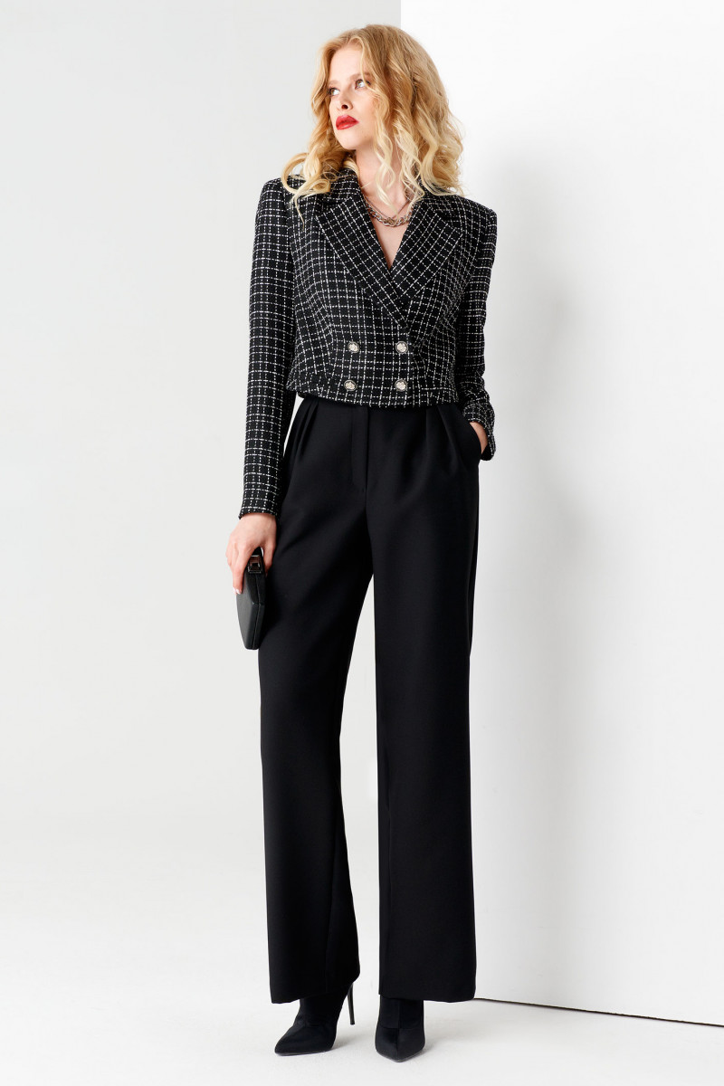 Стильный укороченый жакет из поливискозной ткани в стиле-шанель . Жакет полуприлегающего силуэта, с воротником , с нагрудными вытачками, с двухбортной застежкой на петли пуговицы, с боковыми декоративными рамками. Спинка с талиевыми вытачками и среднем швом. Руква втачные , со шлицей и пуговицами . Короткие жакеты - это тренд этого сезона идеален для офиса, на работу и любого празднования, жакет позволяет создавать привлекательные луки в каждом отдельном случае.