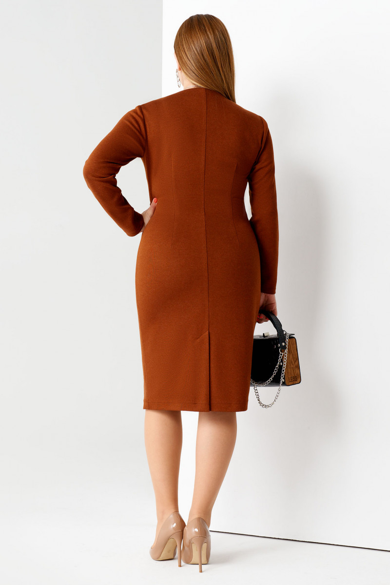 Элегантное трикотажное,мягкое платье прилегающего силуэта, с имитациейе запаха. Лиф отрезной по переду. Запах глубокий,образует V-образный вырез. Край верхней детали запаха оформлен отложным воротником. Спереди по талии выполнен отрезной пояс с пряжкой .Отлетная деталь пояса оформлена в боковом шве.Ниже пояса спереди оформлена отлетная деталь,имитирующая нижнюю часть жакета. Длина платья ниже колена.Рукава втачные длинные. По спинке выполнен средний шов со шлицей по низу и талиевые вытачки. Очень стильное ,оригинальное платье идеально подойдёт энергичной и яркой девушке в качестве комфортного варианта на каждый день.