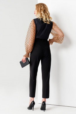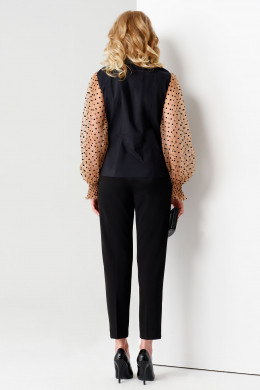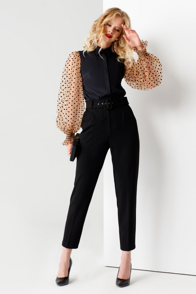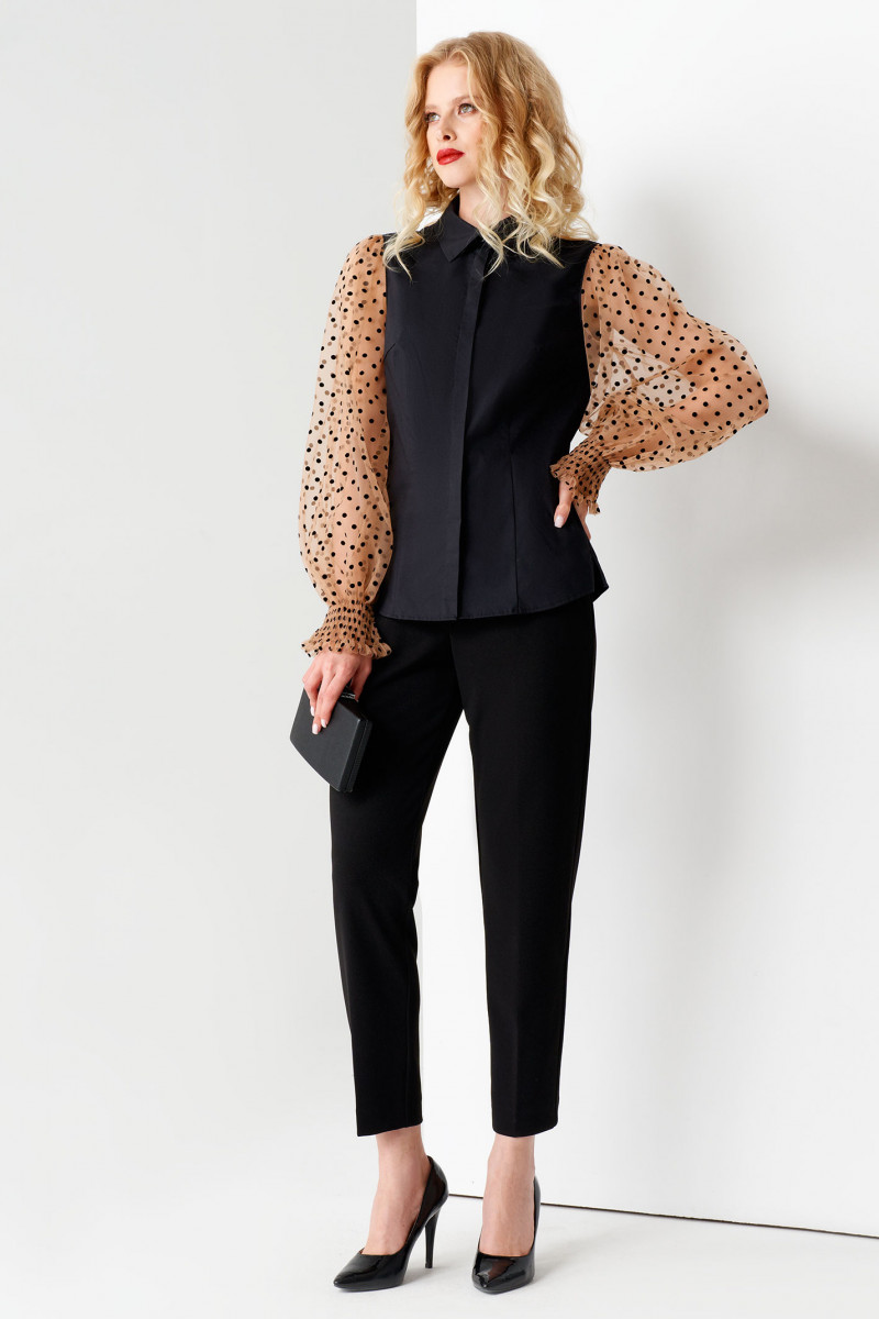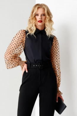 Нарядная блузка с объёмными рукавами. Блузка приталенного силуэта, по переду и по спинки имеются вытачки, которые подчеркиваю изящество. Застежка сквозная на потайную планку. Рукава объёмные со сборкой по окату. Низ рукавов на декоративной манжете с небольшой рюшей. Очень нарядный вариант блузки как в офис, так и для любой вечеринки.