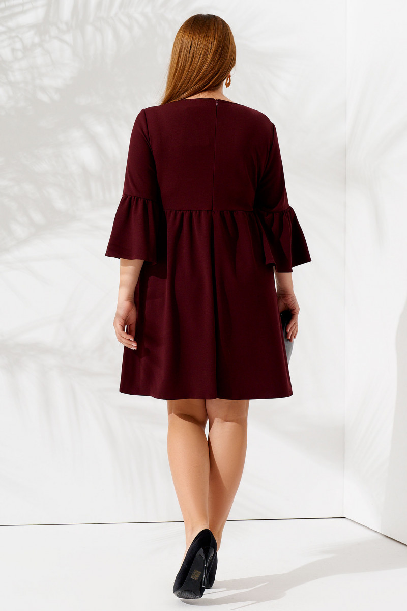 Платье женское выглядит элегантно, благодаря особой форме кроя рукава длиной ¾. Чуть выше локтя он переходит в роскошный широкий волан. Платье женское больших размеров визуально вытягивает силуэт, делает его легче, смещая акценты с проблемных зон и подчеркивая достоинства.