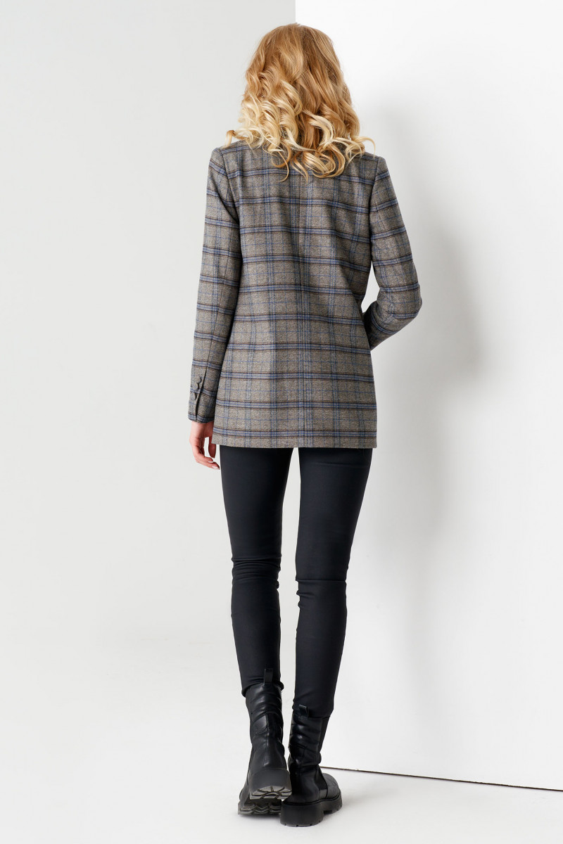 Жакет женский трикотажный изготовлен из вискозы, полиэстера и эластана. Под низом мягкая, приятная на ощупь вискозная подкладка, похожая на шелк. Жакет в клетку женский выполнен в прямом фасоне. V-вырез между 2 бортами визуально удлиняет шею и вытягивает силуэт.