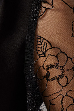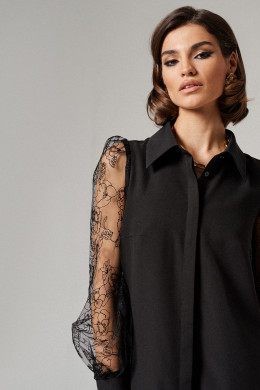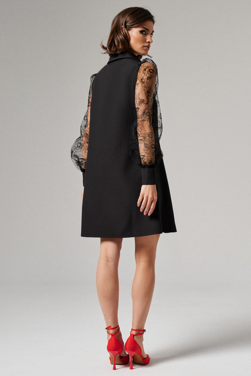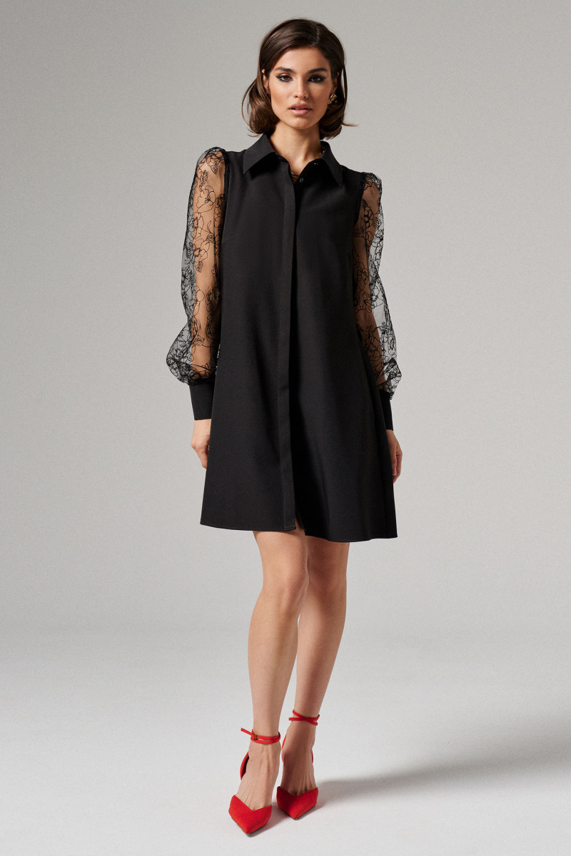 Женское платье с прозрачными рукавами сшито из плотной ткани на основе полиэстера, вискозы и эластана. Практичный материал хорошо держит форму, не мнется и сохраняет свой насыщенный черный оттенок даже после многократных стирок.