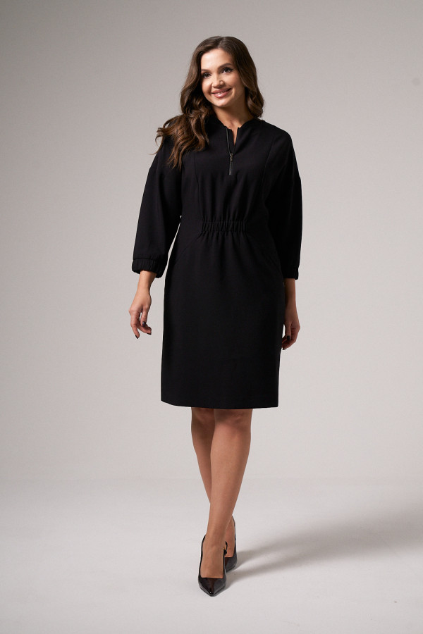 Платье черное визуально скрадывает пышные формы и создает элегантный силуэт. Прямой фасон дополнен рукавом со спущенной линией плеча, образующей мягкие переходы. Трикотажное платье женское на осень украшено V-вырезом на спинке, визуально вытягивающим силуэт и придающим образу пикантную нотку.