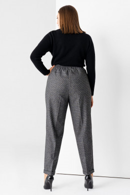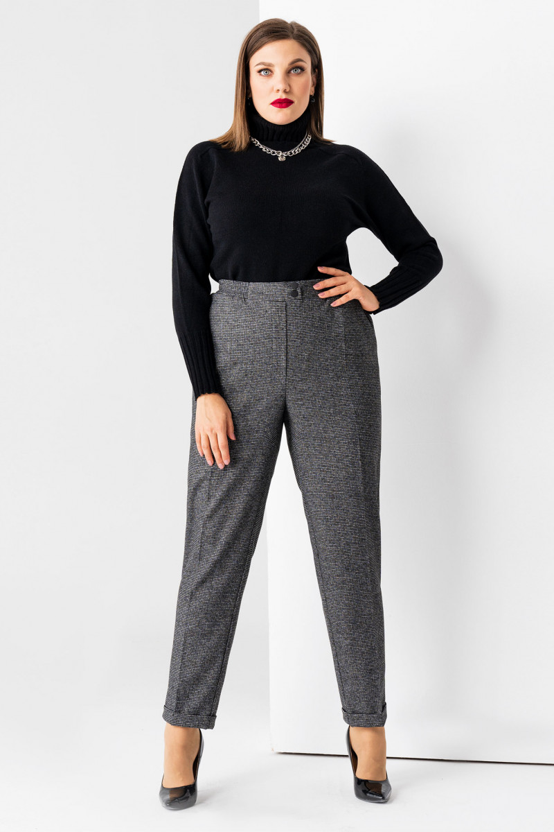 Брюки с высокой посадкой хорошо выглядят на фигуре любого типа, благодаря классическому крою с вертикальными стрелками. Брюки женские большого размера визуально делают талию стройнее, а бедра – уже. По поясу изделия – широкая эластичная резинка, обеспечивающая максимальный комфорт в носке, и две пуговицы. По низу штанин – небольшие подвороты.