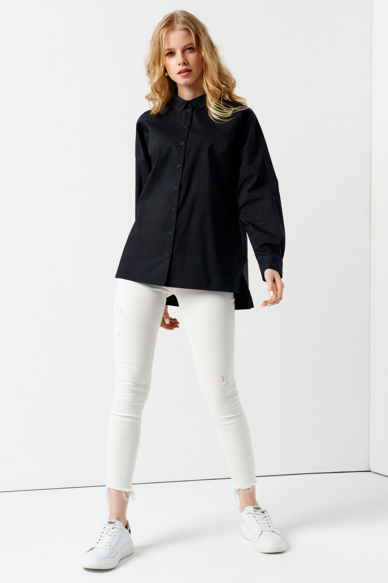 Белая женская рубашка скроена в прямом силуэте с перепадом длины по низу. Спинка, дополненная кокеткой, чуть длиннее переда. Спущенная линия плеча и разрезы в боковых швах сделают вашу фигуру более пропорциональной. Блузка на пуговицах-петлях по центральной застежке пошита с отложным воротником рубашечного типа. Длинные рукава оканчиваются манжетами.