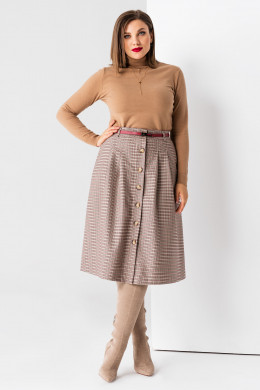 Юбка женская больших размеров безупречно садится по фигуре, благодаря особенностям фасона и глубоким вертикальным складкам. Пояс предусматривает шлевки для ремня. Модель застегивается на пуговицы, расположенные по центральной планке.