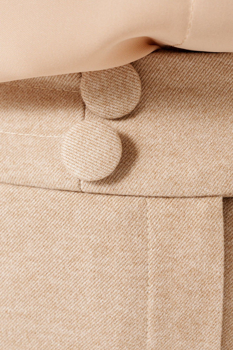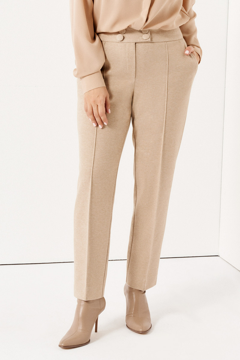 Зауженные брюки изготовлены из плотного трикотажа, который хорошо держит форму, не мнется и согревает в межсезонье. Широкий отрезной пояс украшен декоративными пуговицами. Трикотажные брюки с застежкой тесьмой-молнией и с боковыми разрезами - отличный вариант для повседневной носки.