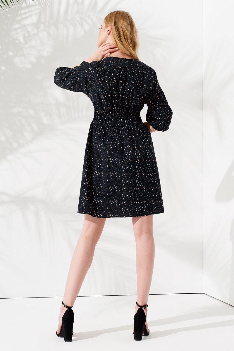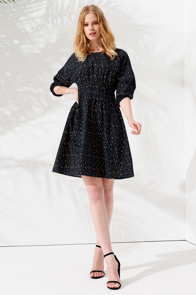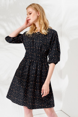 Кокетливое короткое платье поможет создать летний образ ярким и запоминающимся. Оно выполнено из хлопка, поэтому жарит комфорт даже в жаркий день. Вы можете надеть летнее хлопковое платье на вечеринку, встречу с подругами, свидание, посетить в нем кино или кафе. Мини платье с рукавами ¾ черного цвета украшено мелким цветочным принтом. Благодаря этому платье женское короткое легко сочетается с обувью, аксессуарами нейтральных и ярких расцветок. Вы можете купить летнее платье мини со слегка расклешенной юбкой в размерах 42-48.